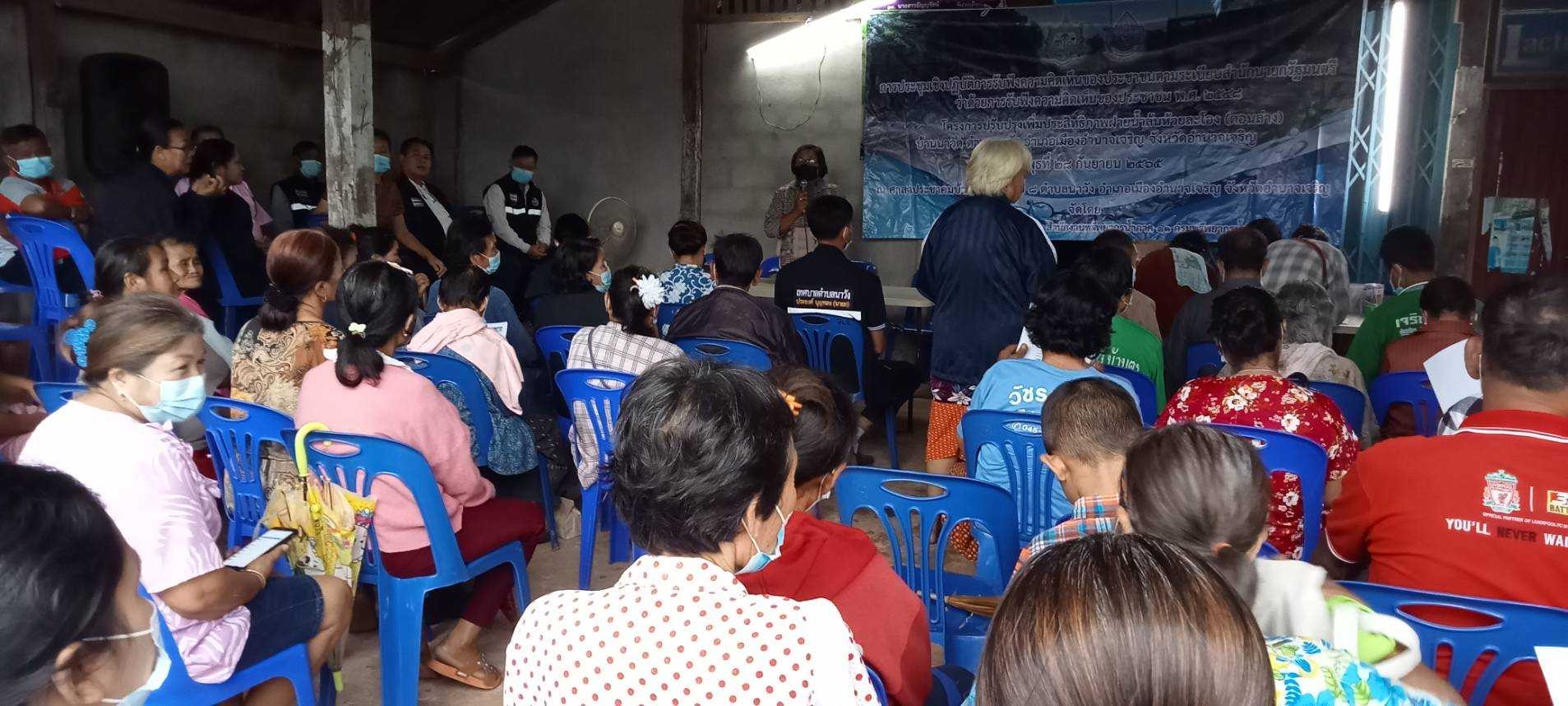 วันที่ 28 กันยายน 2565 นายวิเวช สุทธิประภา ผู้อำนวยการสำนักงาน ทรัพยากรน้ำภาค 11 มอบหมายให้ส่วนแผนงานและประเมินผล ลงพื้นที่เพื่อจัดการประชุมเชิงปฏิบัติการ รับฟังความคิดเห็นของประชาชนตามระเบียบสำนักนายกรัฐมนตรี ว่าด้วยการรับฟังความคิดเห็นของประชาชน พ.ศ. 2548 โครงการปรับปรุงซ่อมแซมฝายห้วยละโอง(ตอนล่าง) หมู่ที่ 8 บ้านนานวัด ตำบลนาวัง อำเภอเมือง จังหวัดอำนาจเจริญ โดยมีวัตถุประสงค์เพื่อชี้แจงรายละเอียดและสาระสำคัญของโครงการรับฟังปัญหา อุปสรรคและแนวทางการแก้ไขในการดำเนินโครงการ ตลอดจนส่งเสริมให้ประชาชนและผู้มีส่วนได้ส่วนเสียในพื้นที่มีส่วนร่วม ในการดำเนินโครงการของกรมทรัพยากรน้ำซึ่งที่ประชุม “มีมติเห็นชอบกับโครงการของกรมทรัพยากรน้ำที่จะมาดำเนินการ” ทั้งนี้ได้ดำเนินการตามมาตรการเฝ้าระวังป้องกันและควบคุมการแพร่ระบาดของโรค COVID – 19 อย่างเคร่งครัด