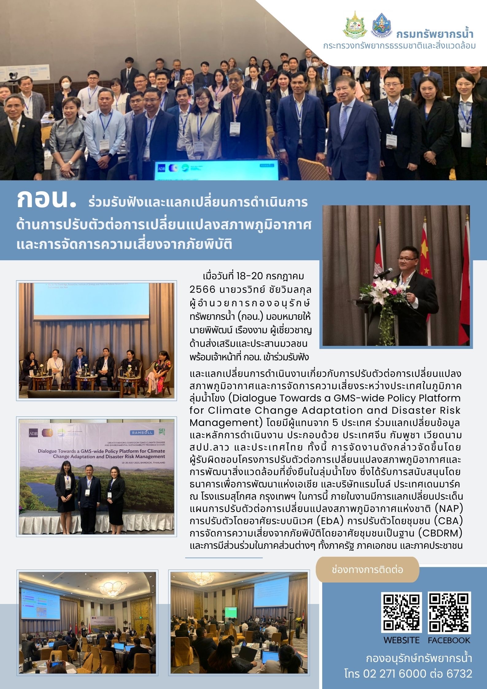 เมื่อวันที่ 18-20 กรกฎาคม 2566 นายวรวิทย์ ชัยวิมลกุล ผู้อำนวยการกองอนุรักษ์ทรัพยากรน้ำ (กอน.) มอบหมายให้ นายพิพัฒน์ เรืองงาม ผู้เชี่ยวชาญด้านส่งเสริมและประสานมวลชน พร้อมเจ้าหน้าที่ กอน. เข้าร่วมรับฟังและแลกเปลี่ยนการดำเนินงานเกี่ยวกับการปรับตัวต่อการเปลี่ยนแปลง
