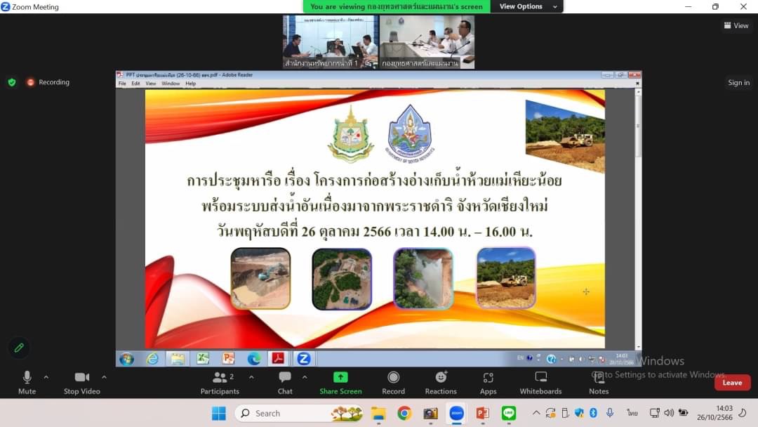นายโอภาส ถาวร ผู้อำนวยการสำนักงานทรัพยากรน้ำที่ 1พร้อมด้วยคณะเจ้าหน้าที่ส่วนพัฒนาและฟื้นฟูแหล่งน้ำและ ส่วนสำรวจออกแบบ พร้อมด้วยผู้อำนวยการกองยุทธศาสตร์ และแผนงาน คณะผู้เชี่ยวชาญ ผู้อำนวยการกองพัฒนาแหล่งน้ำ 1 ผู้อำนวยการกองพัฒนาแหล่งน้ำ 2 และผู้แทนกลุ่มนิติการกรมทรัพยากรน้ำ เข้าร่วมประชุมหารือการดำเนินการโครงการก่อสร้างอ่างเก็บน้ำห้วยแม่เหียะน้อยพร้อมระบบกระจายน้ำอันเนื่องมาจากพระราชดำริ ตำบลแม่เหียะ อำเภอเมืองเชียงใหม่ จังหวัดเชียงใหม่ เพื่อกำหนดแนวทางการบริหารงบประมาณ ในการดำเนินการโครงการให้มีประสิทธิภาพและเป็นไปตามเป้าหมายของกรมทรัพยากรน้ำ