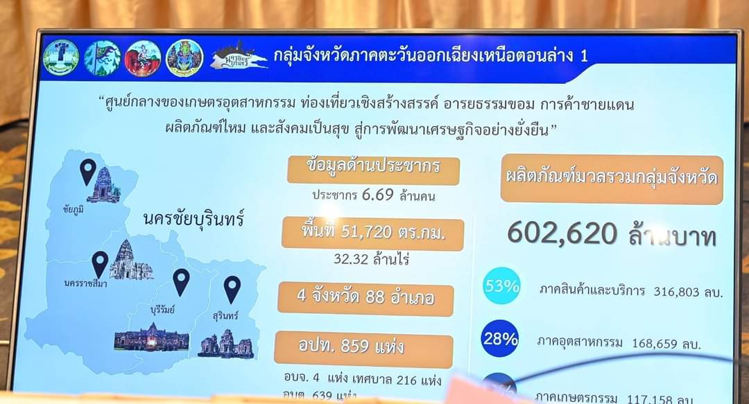 วันนี้ (21 มิ.ย. 67) นายอนุทิน ชาญวีรกูล รองนายกรัฐมนตรี เป็นประธานการประชุมบูรณาการร่วมภาครัฐและเอกชนเพื่อพัฒนากลุ่มจังหวัดภาคตะวันออกเฉียงเหนือตอนล่าง 1 (จังหวัดนครราชสีมา ชัยภูมิ บุรีรัมย์ และสุรินทร์) พร้อมด้วยผู้แทนหน่วยงานที่เกี่ยวข้อง และนายธีระชุณ บุญสิทธิ์ รองอธิบดีกรมทรัพยากรน้ำเข้าร่วม เพื่อบูรณาการร่วมภาครัฐและเอกชนพัฒนากลุ่มจังหวัดภาคตะวันออกเฉียงเหนือตอนล่าง 1 โดยมีประเด็นที่สำคัญคือ ยกระดับการท่องเที่ยวสู่การเป็นจุดหมายในระดับสากล (World Class Tourism) พัฒนาอุตสาหกรรมอาหารแห่งอนาคตและเศรษฐกิจชีวภาพ (Future Food & Bioeconomy) พัฒนาคุณภาพชีวิตและแก้ปัญหาความยากจน และเชื่อมโยงพื้นที่เศรษฐกิจชุมชนกับโครงข่ายคมนาคมหลัก (Logistics Hub) ณ ห้องแกรนด์บอลรูม ชั้น 1 โรงแรมรามาการ์เด้นส์
