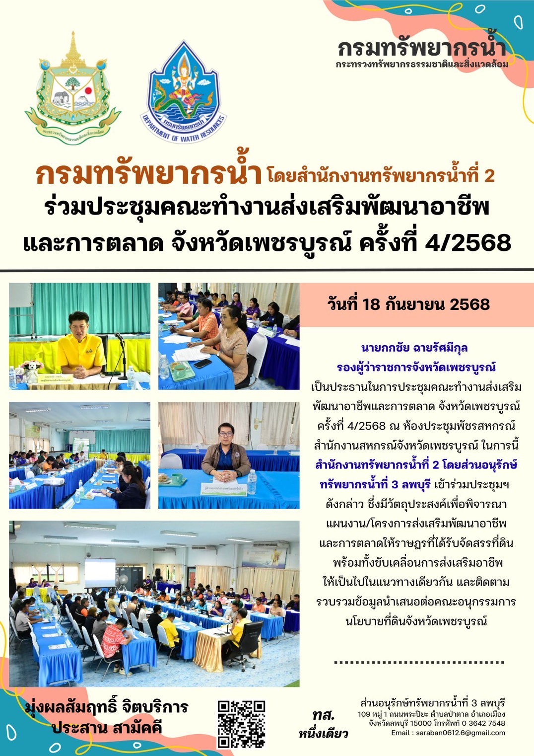 เป็นประธานในการประชุมคณะทำงานส่งเสริมพัฒนาอาชีพและการตลาด จังหวัดเพชรบูรณ์ ครั้งที่ 4/2568 ณ ห้องประชุมพัชรสหกรณ์ สำนักงานสหกรณ์จังหวัดเพชรบูรณ์ ในการนี้สำนักงานทรัพยากรน้ำที่ 2 โดยส่วนอนุรักษ์ทรัพยากรน้ำที่ 3 ลพบุรี เข้าร่วมประชุมฯ
