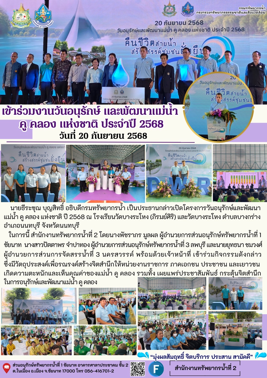 นายธีระชุณ บุญสิทธิ์ อธิบดีกรมทรัพยากรน้ำ เป็นประธานกล่าวเปิดโครงการวันอนุรักษ์และพัฒนาแม่น้ำ คู คลอง แห่งชาติ ปี 2568 ณ โรงเรียนวัดบางระโหง (ภิรมย์ศิริ) และวัดบางระโหง ตำบลบางกร่าง อำเภอนนทบุรี จังหวัดนนทบุรีในการนี้ สำนักงานทรัพยากรน้ำที่ 2 โดยนางพัชราภร มูลผล ผู้อำนวยการส่วนอนุรักษ์ทรัพยากรน้ำที่ 1 ชัยนาท นางสาวปัตตาพร จำปาทอง ผู้อำนวยการส่วนอนุรักษ์ทรัพยากรน้ำที่ 3 ลพบุรี และนายยุทธนา ชมวงศ์ผู้อำนวยการส่วนการจัดสรรน้ำที่ 3 นครสวรรค์ พร้อมด้วยเจ้าหน้าที่ เข้าร่วมกิจกรรมดังกล่าว ซึ่งมีวัตถุประสงค์เพื่อรณรงค์สร้างจิตสำนึกให้หน่วยงานราชการ ภาคเอกชน ประชาชน และเยาวชน เกิดความตะหนักและเห็นคุณค่าของแม่น้ำ คู คลอง รวมทั้ง เผยแพร่ประชาสัมพันธ์ กระตุ้นจิตสำนึกในการอนุรักษ์และพัฒนาแม่น้ำ คู คลอง
