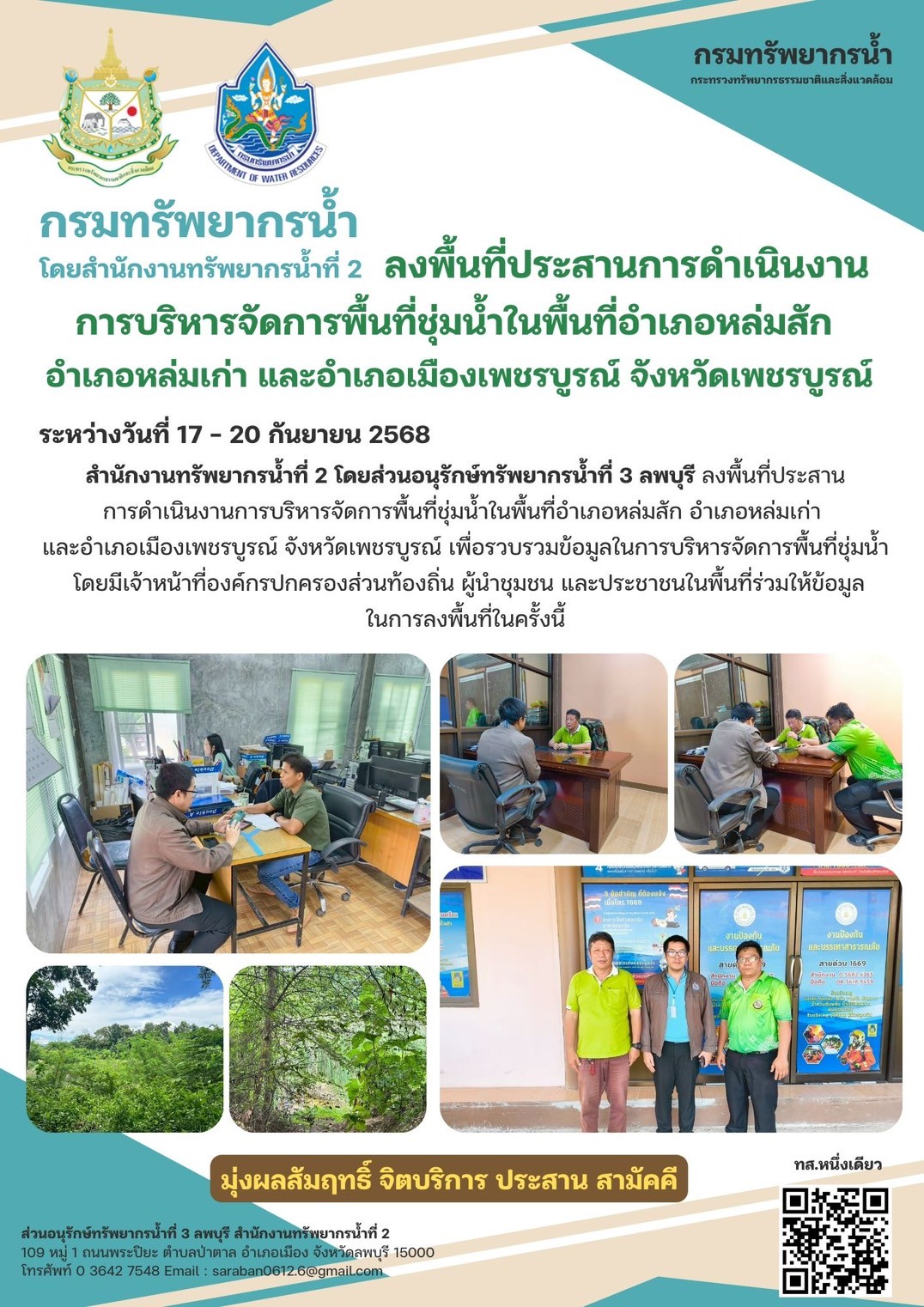 สำนักงานทรัพยากรน้ำที่ 2 โดยส่วนอนุรักษ์ทรัพยากรน้ำที่ 3 ลพบุรี ลงพื้นที่ประสานการดำเนินงานการบริหารจัดการพื้นที่ชุ่มน้ำในพื้นที่อำเภอหล่มสัก อำเภอหล่มเก่า และอำเภอเมืองเพชรบูรณ์ จังหวัดเพชรบูรณ์ เพื่อรวบรวมข้อมูลในการบริหารจัดการพื้นที่ชุ่มน้ำ โดยมีเจ้าหน้าที่องค์กรปกครองส่วนท้องถิ่น ผู้นำชุมชน และประชาชนในพื้นที่ร่วมให้ข้อมูลในการลงพื้นที่ในครั้งนี้