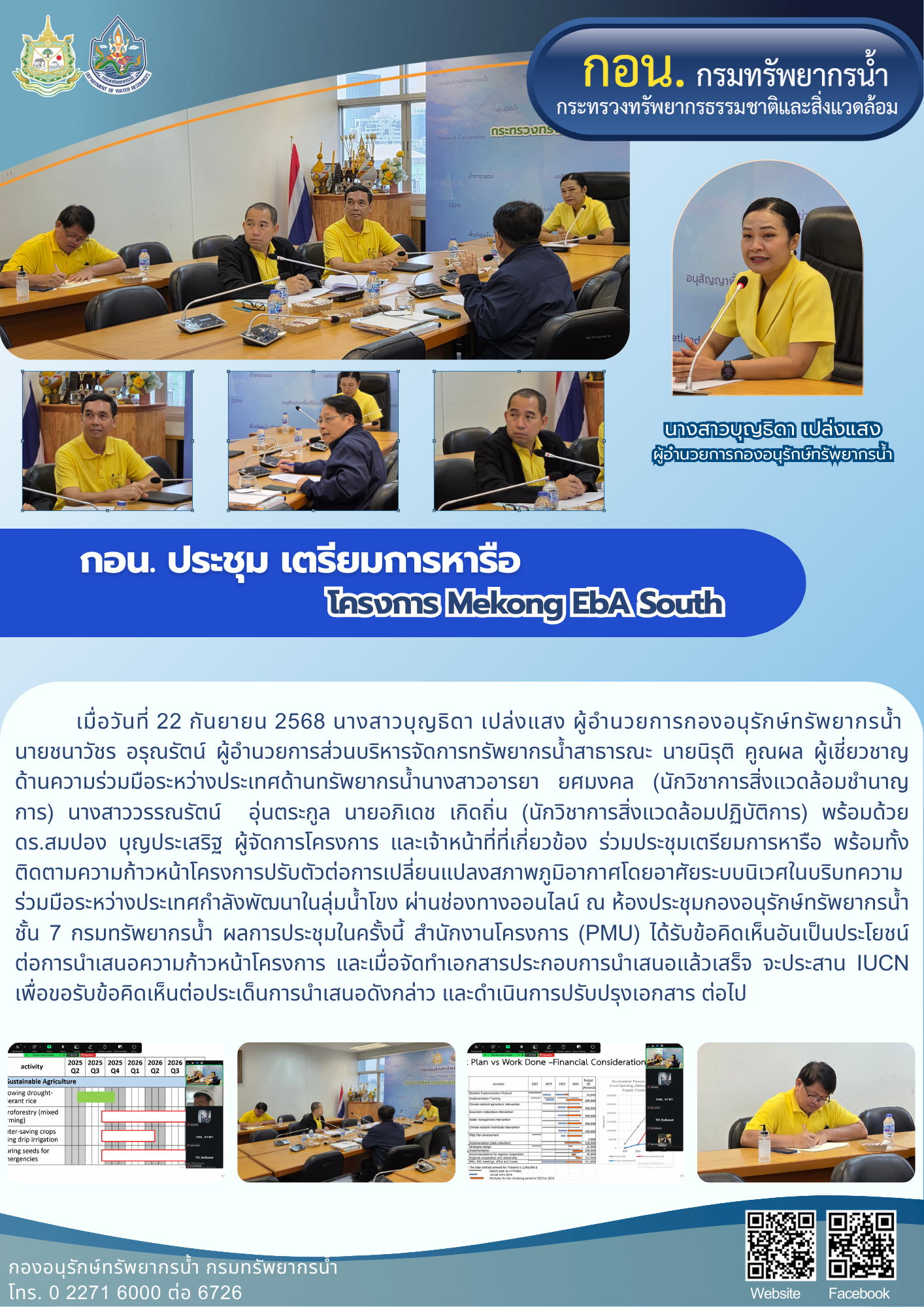 เมื่อวันที่ 22 กันยายน 2568 นางสาวบุญธิดา เปล่งแสง ผู้อำนวยการกองอนุรักษ์ทรัพยากรน้ำ นายชนาวัชร อรุณรัตน์ ผู้อำนวยการส่วนบริหารจัดการทรัพยากรน้ำสาธารณะ นายนิรุติ คูณผล ผู้เชี่ยวชาญด้านความร่วมมือระหว่างประเทศด้านทรัพยากรน้ำนางสาวอารยา ยศมงคล (นักวิชาการสิ่งแวดล้อมชำนาญการ) นางสาววรรณรัตน์ อุ่นตระกูล นายอภิเดช เกิดถิ่น (นักวิชาการสิ่งแวดล้อมปฏิบัติการ) พร้อมด้วย ดร.สมปอง บุญประเสริฐ ผู้จัดการโครงการ และเจ้าหน้าที่ที่เกี่ยวข้อง ร่วมประชุมเตรียมการหารือ พร้อมทั้งติดตามความก้าวหน้าโครงการปรับตัวต่อการเปลี่ยนแปลงสภาพภูมิอากาศโดยอาศัยระบบนิเวศในบริบทความร่วมมือระหว่างประเทศกำลังพัฒนาในลุ่มน้ำโขง ผ่านช่องทางออนไลน์ ณ ห้องประชุมกองอนุรักษ์ทรัพยากรน้ำ ชั้น 7 กรมทรัพยากรน้ำ ผลการประชุมในครั้งนี้ สำนักงานโครงการ (PMU) ได้รับข้อคิดเห็นอันเป็นประโยชน์ต่อการนำเสนอความก้าวหน้าโครงการ และเมื่อจัดทำเอกสารประกอบการนำเสนอแล้วเสร็จ จะประสาน IUCN เพื่อขอรับข้อคิดเห็นต่อประเด็นการนำเสนอดังกล่าว และดำเนินการปรับปรุงเอกสาร ต่อไป