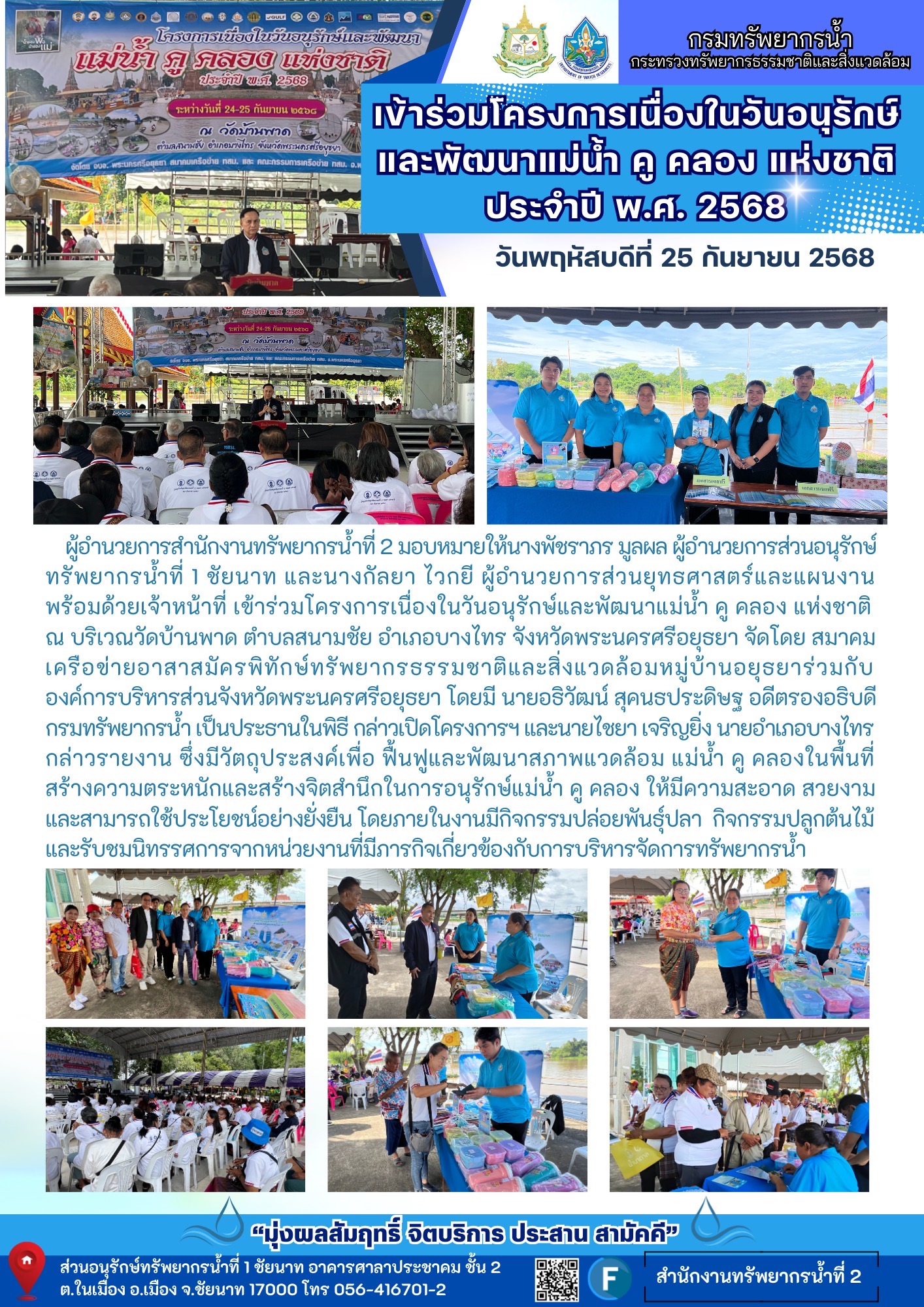 ผู้อำนวยการสำนักงานทรัพยากรน้ำที่ 2 มอบหมายให้นางพัชราภร มูลผล ผู้อำนวยการส่วนอนุรักษ์ทรัพยากรน้ำที่ 1 ชัยนาท และนางกัลยา ไวกยี ผู้อำนวยการส่วนยุทธศาสตร์และแผนงาน พร้อมด้วยเจ้าหน้าที่ เข้าร่วมโครงการเนื่องในวันอนุรักษ์และพัฒนาแม่น้ำ คู คลอง แห่งชาติ ประจำปี พ.ศ. 2568 ณ บริเวณวัดบ้านพาด ตำบลสนามชัย อำเภอบางไทร จังหวัดพระนครศรีอยุธยา จัดโดย สมาคมเครือข่ายอาสาสมัครพิทักษ์ทรัพยากรธรรมชาติและสิ่งแวดล้อมหมู่บ้านอยุธยา ร่วมกับองค์การบริหารส่วนจังหวัดพระนครศรีอยุธยา โดยมี นายอธิวัฒน์ สุคนธประดิษฐ อดีตรองอธิบดีกรมทรัพยากรน้ำ เป็นประธานในพิธี กล่าวเปิดโครงการฯ และนายไชยา เจริญยิ่ง นายอำเภอบางไทร กล่าวรายงาน ซึ่งมีวัตถุประสงค์เพื่อ ฟื้นฟูและพัฒนาสภาพแวดล้อม แม่น้ำ คู คลองในพื้นที่ สร้างความตระหนักและสร้างจิตสำนึกในการอนุรักษ์แม่น้ำ คู คลอง ให้มีความสะอาด สวยงาม และสามารถใช้ประโยชน์อย่างยั่งยืน โดยภายในงานมีกิจกรรมปล่อยพันธ์ุปลา กิจกรรมปลูกต้นไม้ และรับชมนิทรรศการจากหน่วยงานที่มีภารกิจเกี่ยวข้องกับการบริหารจัดการทรัพยากรน้ำ