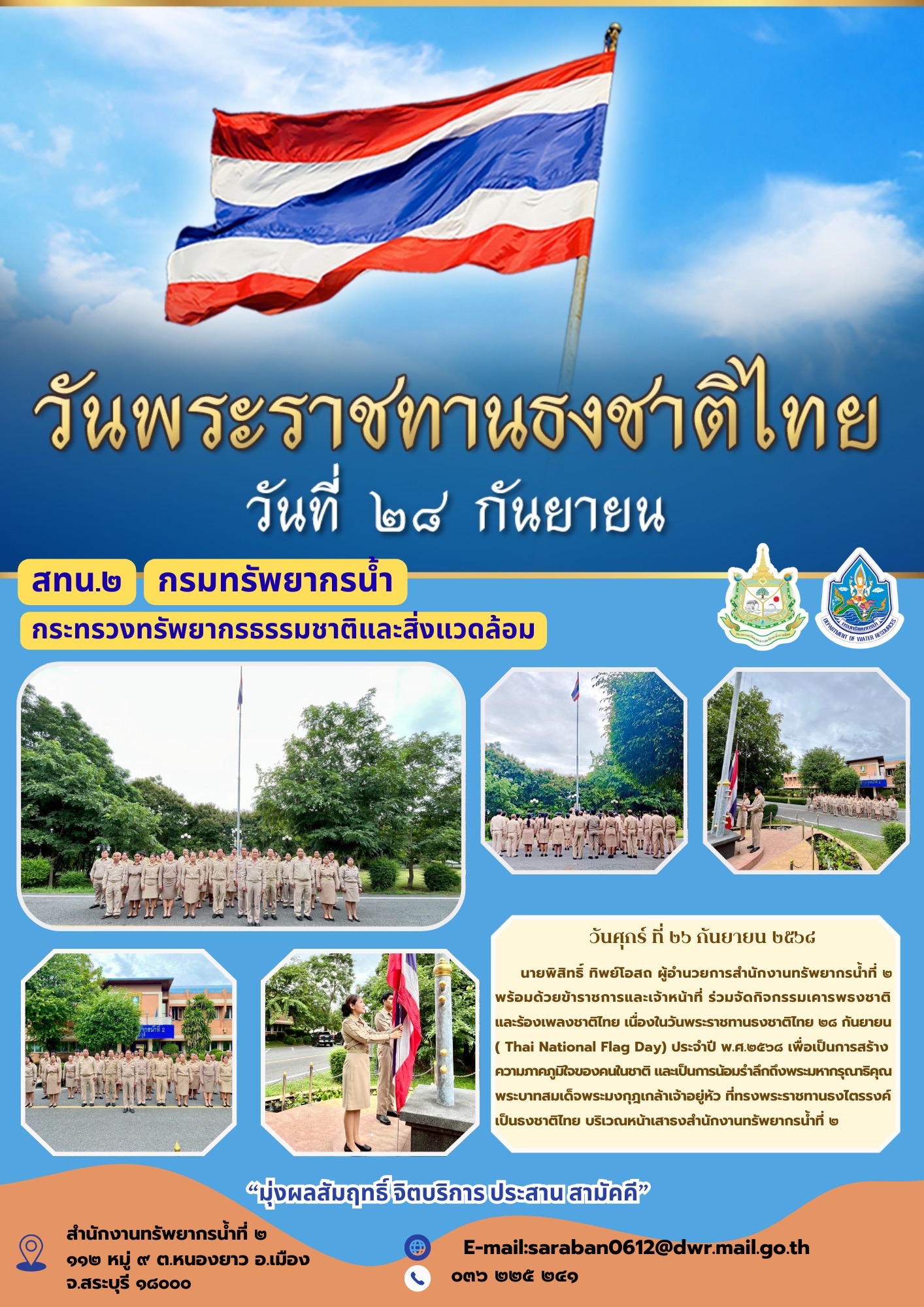 นายพิสิทธิ์ ทิพย์โอสถ ผู้อำนวยการสำนักงานทรัพยากรน้ำที่ ๒พร้อมด้วยข้าราชการและเจ้าหน้าที่ ร่วมจัดกิจกรรมเคารพธงชาติและร้องเพลงชาติไทย เนื่องในวันพระราชทานธงชาติไทย ๒๘ กันยายน ( Thai National Flag Day) ประจำปี พ.ศ.๒๕๖๘ เพื่อเป็นการสร้างความภาคภูมิใจของคนในชาติ และเป็นการน้อมรำลึกถึงพระมหากรุณาธิคุณพระบาทสมเด็จพระมงกุฎเกล้าเจ้าอยู่หัว ที่ทรงพระราชทานธงไตรรงค์เป็นธงชาติไทย บริเวณหน้าเสาธงสำนักงานทรัพยากรน้ำที่ ๒
