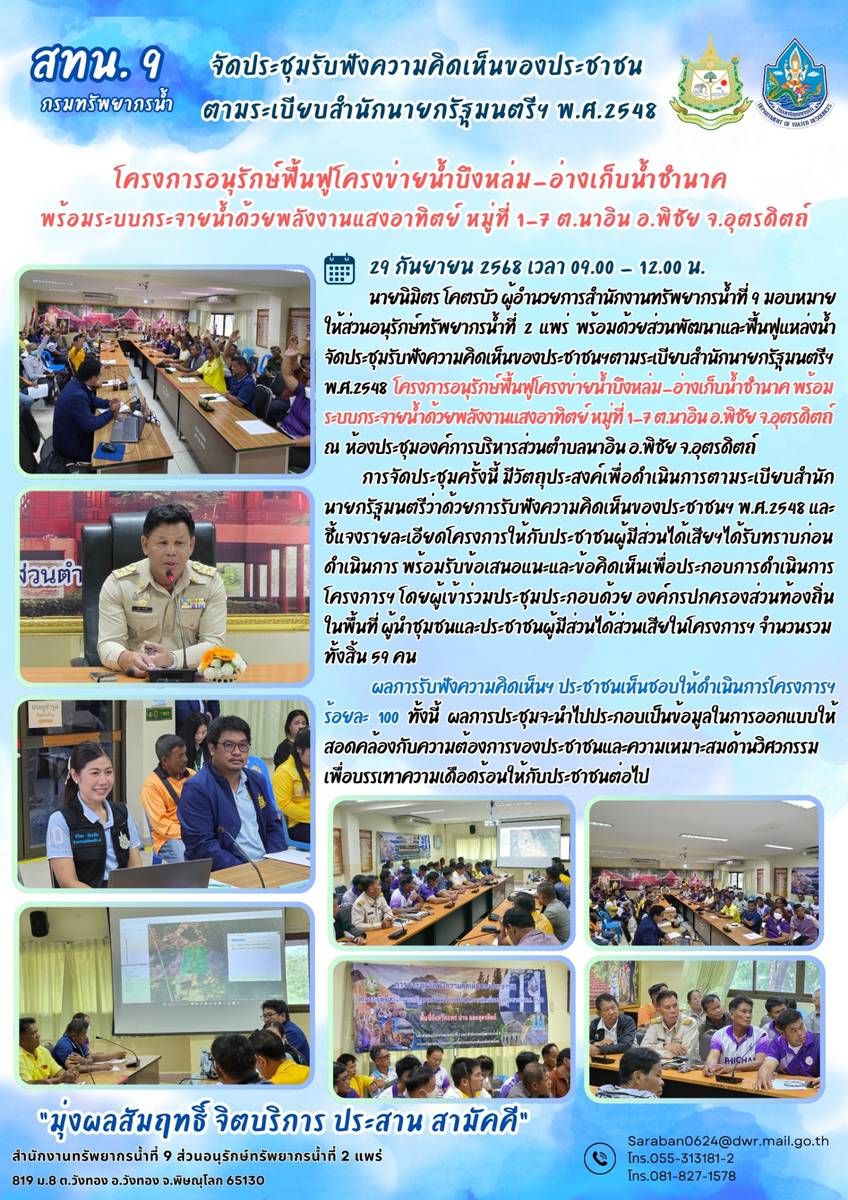 นายนิมิตร โคตรบัว ผู้อำนวยการสำนักงานทรัพยากรน้ำที่ 9 มอบหมายให้ส่วนอนุรักษ์ทรัพยากรน้ำที่ 2 แพร่ พร้อมด้วยส่วนพัฒนาและฟื้นฟูแหล่งน้ำ จัดประชุมรับฟังความคิดเห็นของประชาชนฯ ตามระเบียบสำนักนายกรัฐมนตรีฯ พ.ศ.2548 โครงการอนุรักษ์ฟื้นฟูโครงข่ายน้ำบึงหล่ม-อ่างเก็บน้ำชำนาคพร้อมระบบกระจายน้ำด้วยพลังงานแสงอาทิตย์ หมู่ที่ 1-7 ต.นาอิน อ.พิชัย จ.อุตรดิตถ์ ณ ห้องประชุมองค์การบริหารส่วนตำบลนาอิน อ.พิชัย จ.อุตรดิตถ์