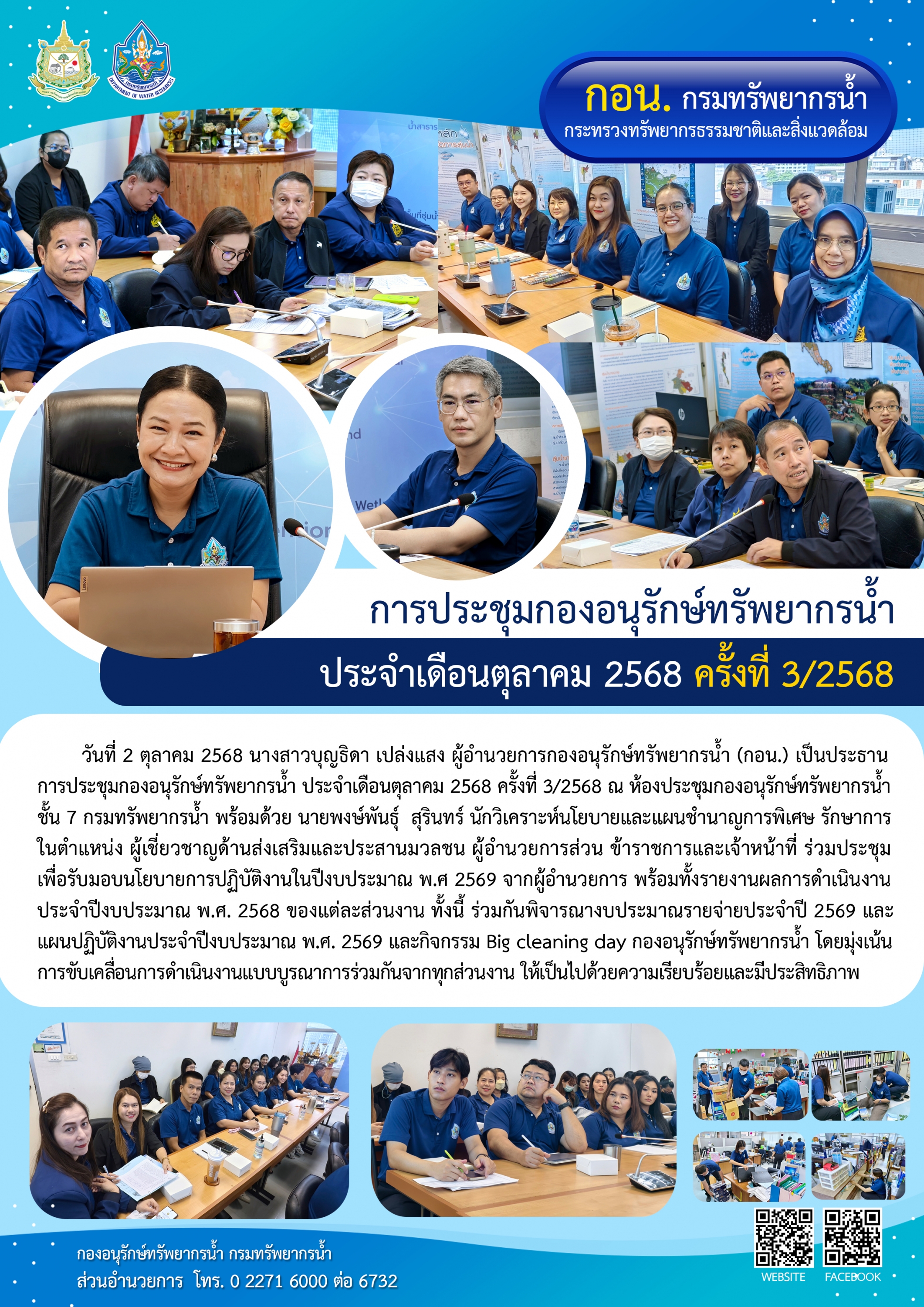 วันที่ 2 ตุลาคม 2568 นางสาวบุญธิดา เปล่งแสง ผู้อำนวยการกองอนุรักษ์ทรัพยากรน้ำ (กอน.) เป็นประธาน การประชุมกองอนุรักษ์ทรัพยากรน้ำ ประจำเดือนตุลาคม 2568 ครั้งที่ 3/2568 ณ ห้องประชุมกองอนุรักษ์ทรัพยากรน้ำ ชั้น 7 กรมทรัพยากรน้ำ พร้อมด้วย นายพงษ์พันธุ์ สุรินทร์ นักวิเคราะห์นโยบายและแผนชำนาญการพิเศษ รักษาการในตำแหน่ง ผู้เชี่ยวชาญด้านส่งเสริมและประสานมวลชน ผู้อำนวยการส่วน ข้าราชการและเจ้าหน้าที่ ร่วมประชุมเพื่อรับมอบนโยบายการปฏิบัติงานในปีงบประมาณ พ.ศ 2569 จากผู้อำนวยการ พร้อมทั้งรายงานผลการดำเนินงานประจำปีงบประมาณ พ.ศ. 2568 ของแต่ละส่วนงาน ทั้งนี้ ร่วมกันพิจารณางบประมาณรายจ่ายประจำปี 2569 และแผนปฏิบัติงานประจำปีงบประมาณ พ.ศ. 2569 และกิจกรรม Big cleaning day กองอนุรักษ์ทรัพยากรน้ำ โดยมุ่งเน้นการขับเคลื่อนการดำเนินงานแบบบูรณาการร่วมกันจากทุกส่วนงาน ให้เป็นไปด้วยความเรียบร้อยและมีประสิทธิภาพ