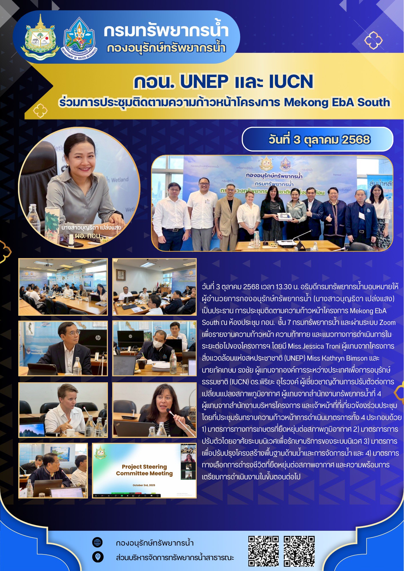 วันที่ 3 ตุลาคม 2568 เวลา 13.30 น. อธิบดีกรมทรัพยากรน้ำ มอบหมายให้ผู้อำนวยการกองอนุรักษ์ทรัพยากรน้ำ (นางสาวบุญธิดา เปล่งแสง) เป็นประธาน การประชุมติดตามความก้าวหน้าโครงการ Mekong EbA South ณ ห้องประชุม กอน. ชั้น 7 กรมทรัพยากรน้ำ และผ่านระบบ Zoom เพื่อรายงานความก้าวหน้า ความท้าทาย และแนวทางการดำเนินการในระยะต่อไปของโครงการฯ โดยมี Miss Jessica Troni ผู้แทนจากโครงการสิ่งแวดล้อมแห่งสหประชาชาติ (UNEP) Miss Kathryn Bimson และนายภัคเกษม ธงชัย ผู้แทนจากองค์การระหว่างประเทศเพื่อการอนุรักษ์ธรรมชาติ (IUCN) ดร.พิริยะ อุไรวงค์ ผู้เชี่ยวชาญด้านการปรับตัวต่อการเปลี่ยนแปลงสภาพภูมิอากาศ ผู้แทนจากสำนักงานทรัพยากรน้ำที่ 4 ผู้แทนจากสำนักงานบริหารโครงการ และเจ้าหน้าที่ที่เกี่ยวข้องร่วมประชุม โดยที่ประชุมรับทราบความก้าวหน้าการดำเนินมาตรการทั้ง 4 ประกอบด้วย 1) มาตรการทางการเกษตรที่ยืดหยุ่นต่อสภาพภูมิอากาศ 2) มาตรการ
