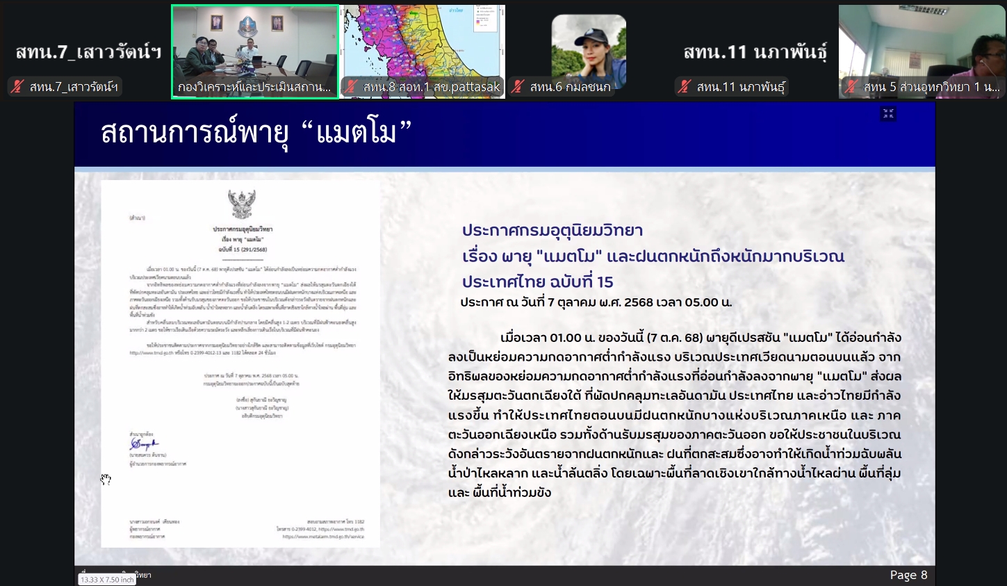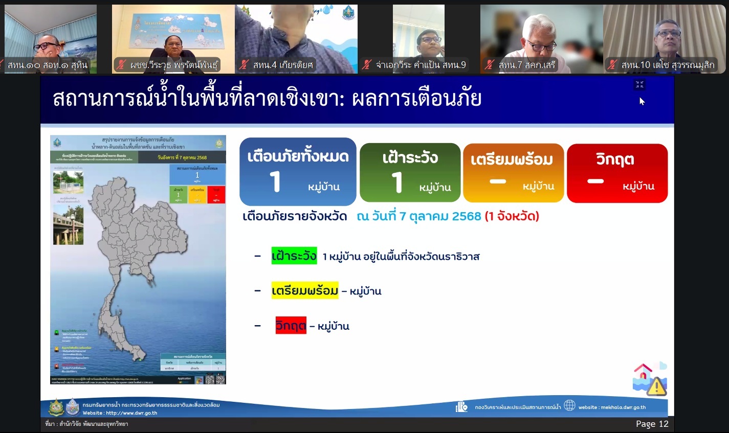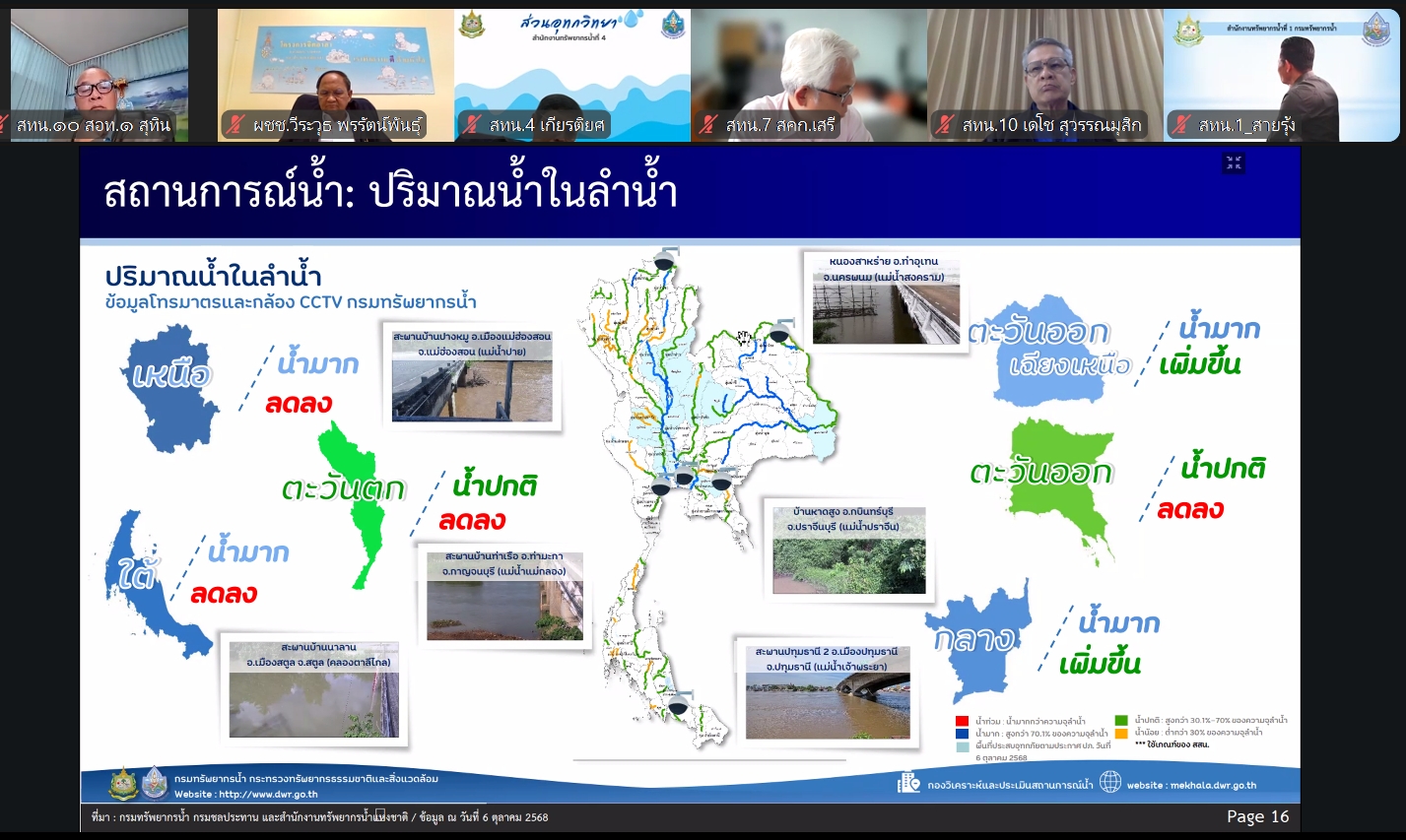 วันที่ 7 ตุลาคม 2568 นายอนันต์ โพธิ์พันธุ์ ผู้อำนวยการสำนักงานทรัพยากรน้ำที่ 7 มอบหมายให้ส่วนเครื่องกล และส่วนอุทกวิทยา เข้าร่วมประชุมคณะทำงานด้านการประเมินสถานการณ์น้ำและการบริหารจัดการน้ำ ครั้งที่ 22/2568 ผ่านสื่ออิเล็กทรอนิกส์ระบบ ZOOM โดยมี นายสุประภาส พัฒน์สิงหเสนีย์ ผู้อำนวยการกองวิเคราะห์และประเมินสถานการณ์น้ำเป็นประธานการประชุมเพื่อรายงานสถานการณ์น้ำการเตรียมพร้อมรับมือ และการให้ความช่วยเหลือพื้นที่ภัยแล้งและน้ำท่วม โดยส่วนเครื่องกลรายงานการให้ความช่วยเหลือพื้นที่ประสบปัญหาน้ำท่วม และพื้นที่ขาดแคลนน้ำใช้ในการอุปโภคบริโภคและการเกษตร รวมถึงการเตรียมความพร้อมอุปกรณ์ เครื่องมือ เครื่องจักร เพื่อรองรับภาวะน้ำแล้งและน้ำท่วม