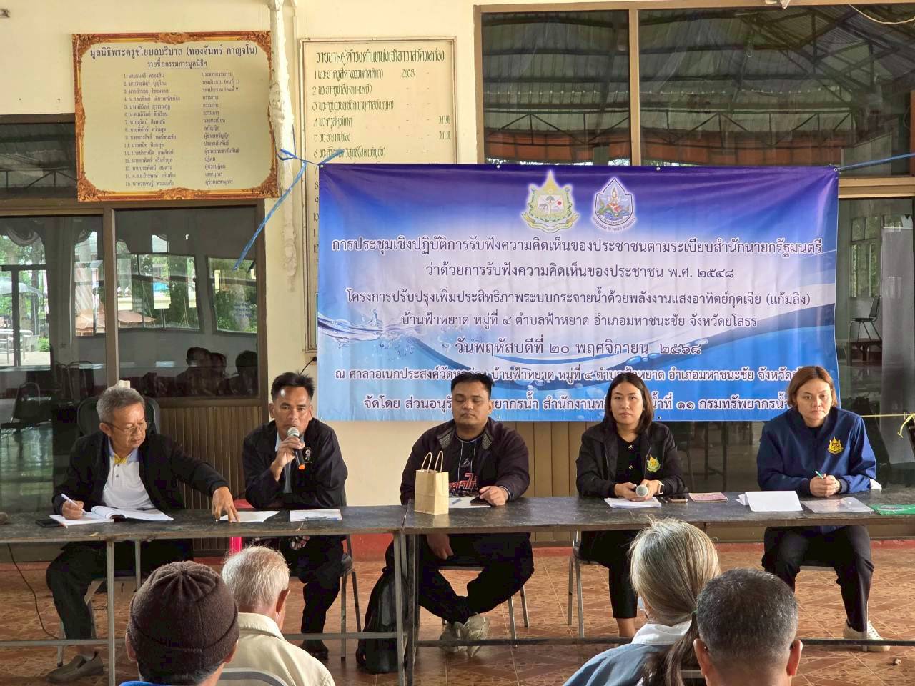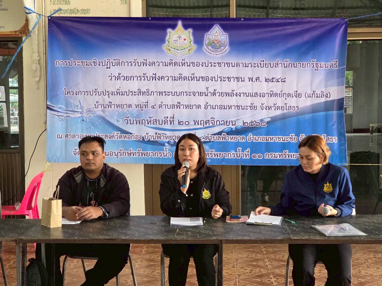 วันที่ 20 พฤศจิกายน 2568 นายโภคิน ช้ำเกตุ ผู้อำนวยการสำนักงานทรัพยากรน้ำที่ 11 มอบหมายให้เจ้าหน้าที่ส่วนอนุรักษ์ทรัพยากรน้ำลงพื้นที่เพื่อจัดประชุมเชิงปฏิบัติการ รับฟังความคิดเห็นของประชาชนตามระเบียบสำนักนายกรัฐมนตรีว่าด้วยการรับฟัง ความคิดเห็นของประชาชน พ.ศ. 2548 “โครงการปรับปรุงเพิ่มประสิทธิภาพระบบกระจายน้ำ ด้วยพลังงานแสงอาทิตย์กุดเจีย (แก้มลิง)” บ้านฟ้าหยาด หมู่ที่ 4 ตำบลฟ้าหยาด อำเภอมหาชนะชัย จังหวัดยโสธร ณ ศาลาอเนกประสงค์วัดหอก่อง บ้านฟ้าหยาด หมู่ที่ 4 มีประชาชนในพื้นที่เข้ารับฟังโครงการฯ จำนวน 61 ราย ทั้งนี้ ได้มีการชี้แจงรายละเอียด เกี่ยวกับโครงการของกรมทรัพยากรน้ำที่จะเข้ามาดำเนินการในพื้นที่ ซึ่งที่ประชุมฯ มีมติ เห็นชอบ ให้ดำเนินโครงการฯ และให้ข้อคิดเห็นข้อเสนอแนะที่เป็นประโยชน์โดยสำนักงาน ทรัพยากรน้ำที่ 11 จะนำข้อเสนอแนะและความต้องการของที่ประชุมไปพิจารณาดำเนินการเพื่อขอรับการสนับสนุนงบประมาณการก่อสร้างโครงการต่อไป
