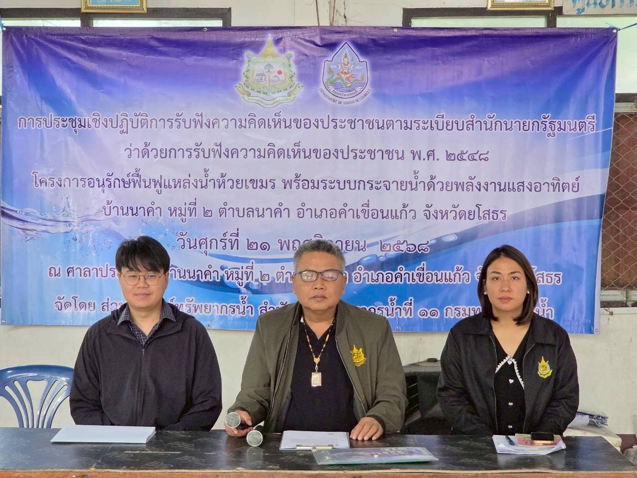 วันที่ 21 พฤศจิกายน 2568 นายโภคิน ช้ำเกตุ ผู้อำนวยการสำนักงานทรัพยากรน้ำที่ 11 มอบหมายให้เจ้าหน้าที่ส่วนอนุรักษ์ทรัพยากรน้ำลงพื้นที่เพื่อจัดประชุมเชิงปฏิบัติการ รับฟังความคิดเห็นของประชาชนตามระเบียบสำนักนายกรัฐมนตรีว่าด้วยการรับฟัง ความคิดเห็นของประชาชน พ.ศ. 2548 “โครงการอนุรักษ์ฟื้นฟูแหล่งน้ำห้วยเขมร พร้อมระบบกระจายน้ำด้วยพลังงานแสงอาทิตย์” บ้านนาคำ หมู่ที่ 2 ตำบลนาคำ อำเภอคำเขื่อนแก้ว จังหวัดยโสธร ณ ศาลาประชาคมบ้านนาคำ หมู่ที่ 2 มีประชาชน ในพื้นที่เข้ารับฟังโครงการฯ จำนวน 62 ราย ทั้งนี้ ได้มีการชี้แจงรายละเอียดเกี่ยวกับ โครงการของกรมทรัพยากรน้ำที่จะเข้ามาดำเนินการในพื้นที่ ซึ่งที่ประชุมฯ มีมติเห็นชอบ ให้ดำเนินโครงการฯ และให้ข้อคิดเห็นข้อเสนอแนะที่เป็นประโยชน์โดยสำนักงาน ทรัพยากรน้ำที่ 11 จะนำข้อเสนอแนะและความต้องการของที่ประชุมไปพิจารณา ดำเนินการเพื่อขอรับการสนับสนุนงบประมาณการก่อสร้างโครงการต่อไป