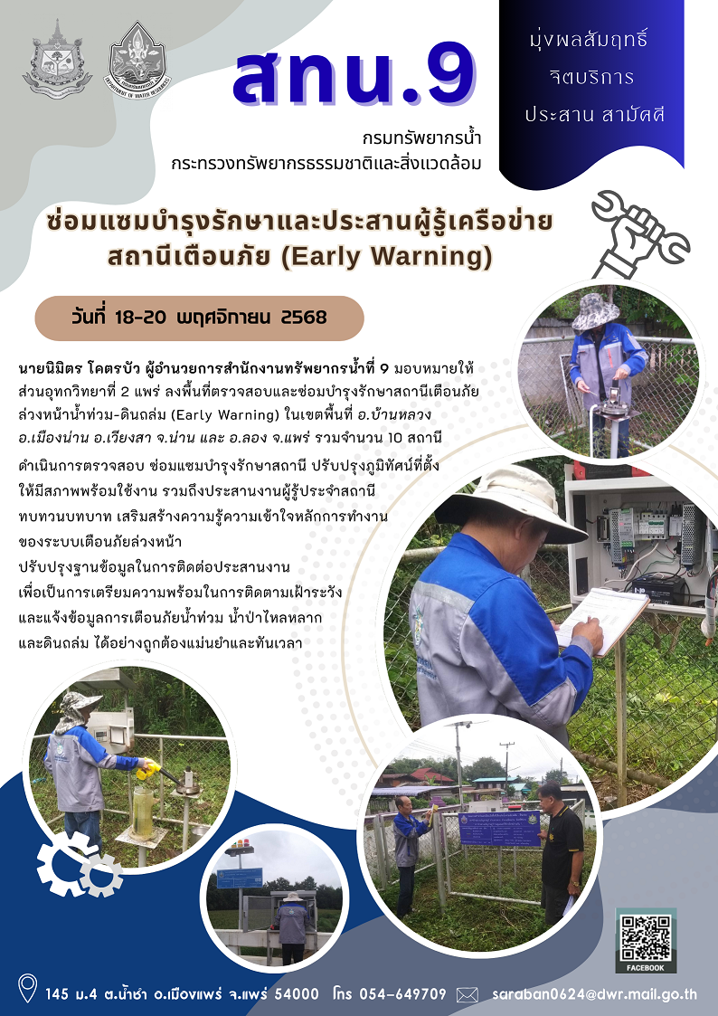 วันที่ 18-20 พฤศจิกายน 2568 นายนิมิตร โคตรบัว ผู้อำนวยการสำนักงานทรัพยากรน้ำที่ 9 มอบหมายให้ ส่วนอุทกวิทยาที่ 2 แพร่ ลงพื้นที่ตรวจสอบและซ่อมบำรุงรักษาสถานีเตือนภัยล่วงหน้า น้ำท่วม-ดินถล่ม (Early Warning) ในเขตพื้นที่ อ.บ้านหลวง อ.เมืองน่าน อ.เวียงสา จ.น่าน และ อ.ลอง จ.แพร่ รวมจำนวน 10 สถานี ดำเนินการตรวจสอบ ซ่อมแซมบำรุงรักษาสถานี ปรับปรุงภูมิทัศน์ที่ตั้งให้มีสภาพพร้อมใช้งาน รวมถึงประสานงานผู้รู้ประจำสถานีทบทวนบทบาท เสริมสร้างความรู้ความเข้าใจหลักการทำงานของระบบเตือนภัยล่วงหน้า ปรับปรุงฐานข้อมูลในการติดต่อประสานงาน เพื่อเป็นการเตรียมความพร้อมในการติดตามเฝ้าระวังและแจ้งข้อมูลการเตือนภัยน้ำท่วม น้ำป่าไหลหลาก และดินถล่ม ได้อย่างถูกต้องแม่นยำและทันเวลา
