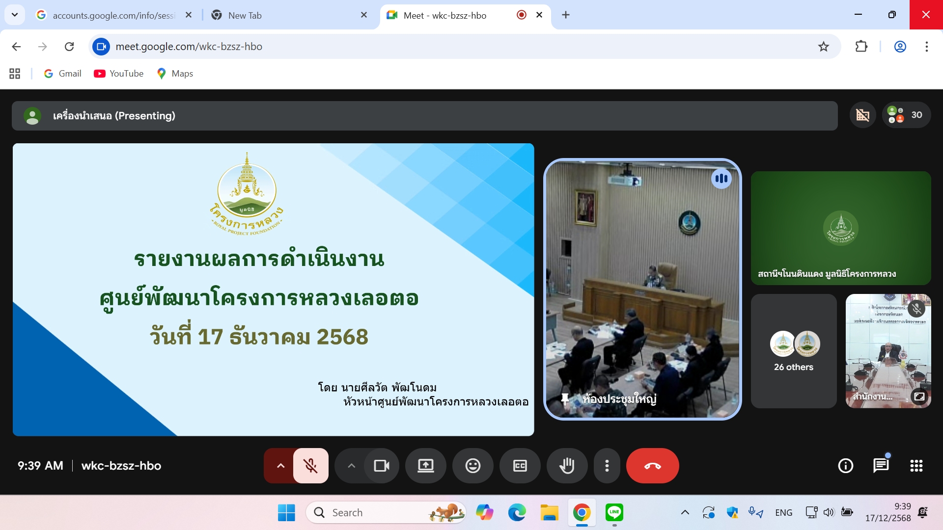 นางสาวสุพัดสอน สีมืด ผู้อำนวยการสำนักงานทรัพยากรน้ำที่ 1 มอบหมายให้ นายจิรวิทย์ อุตสาห์ ผู้อำนวยการส่วนการจัดสรรน้ำที่ 2 ลำพูน พร้อมเจ้าหน้าที่ที่เกี่ยวข้อง เข้าร่วมประชุมคณะกรรมการกลั่นกรองและขับเคลื่อนการปฏิบัติตามนโยบาย ครั้งที่ 3/2569 ประจำเดือนธันวาคม 2568 ผ่านระบบประชุมออนไลน์ โดยมี พลเอก กัมปนาท รุดดิษฐ์ องคมนตรี ประธานคณะกรรมการบริหารมูลนิธิโครงการหลวง เป็นประธานคณะกรรมการกลั่นกรองและขับเคลื่อนการปฏิบัติงานตามนโยบาย ณ ศูนย์วิจัยและพัฒนาการเกษตรโครงการหลวงชนกาธิเบศรดำริ จังหวัดเชียงใหม่ และ ผ่านสื่ออิเล็กทรอนิกส์ด้วยโปรแกรม Google Meet เพื่อรับทราบแผนการดำเนินงาน เสนอความคิดเห็น และร่วมกันพิจารณาแนวทางการดำเนินงานต่อคณะกรรมการกลั่นกรองและขับเคลื่อนการปฏิบัติตามนโยบาย เป็นไปตามที่กำหนด และให้การดำเนินงานเป็นไปอย่างมีประสิทธิภาพ