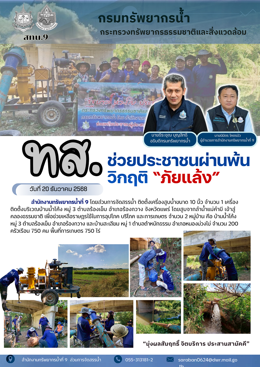 สำนักงานทรัพยากรน้ำที่ 9 โดยส่วนการจัดสรรน้ำ ติดตั้งเครื่องสูบน้ำขนาด 10 นิ้ว จำนวน 1 เครื่อง ติดตั้งบริเวณบ้านน้ำโค้ง หมู่ 3 ตำบลร้องเข็ม อำเภอร้องกวาง จังหวัดแพร่ โดยสูบจากลำน้ำแม่คำมี เข้าสู่คลองธรรมชาติ เพื่อช่วยเหลือราษฎรใช้ในการอุปโภค บริโภค และการเกษตร จำนวน 2 หมู่บ้าน คือ บ้านน้ำโค้ง หมู่ 3 ตำบลร้องเข็ม อำเภอร้องกวาง และบ้านสะเลียม หมู่ 1 ตำบลตำหนักธรรม อำเภอหนองม่วงไข่ จำนวน 200 ครัวเรือน 750 คน พื้นที่การเกษตร 750 ไร่