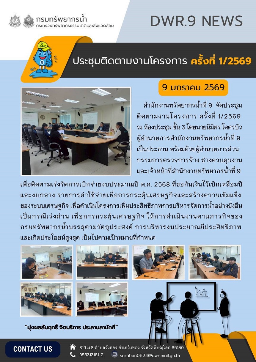 วันที่ 9 มกราคม 2569 สำนักงานทรัพยากรน้ำที่ 9 จัดประชุมติดตามงานโครงการ ครั้งที่ 1/2569 ณ ห้องประชุม ชั้น 3 โดยนายนิมิตร โคตรบัว ผู้อำนวยการสำนักงานทรัพยากรน้ำที่ 9 เป็นประธาน พร้อมด้วยผู้อำนวยการส่วน กรรมการตรวจการจ้าง ช่างควบคุมงานและเจ้าหน้าที่สำนักงานทรัพยากรน้ำที่ 9เพื่อติดตามเร่งรัดการเบิกจ่ายงบประมาณปี พ.ศ. 2568 ที่ขอกันเงินไว้เบิกเหลื่อมปีและงบกลาง รายการค่าใช้จ่ายเพื่อการกระตุ้นเศรษฐกิจและสร้างความเข้มแข็งของระบบเศรษฐกิจ เพื่อดำเนินโครงการเพิ่มประสิทธิภาพการบริหารจัดการน้ำอย่างยั่งยืน เป็นกรณีเร่งด่วน เพื่อการกระตุ้นเศรษฐกิจ ให้การดำเนินงานตามภารกิจของกรมทรัพยากรน้ำบรรลุตามวัตถุประสงค์ การบริหารงบประมาณมีประสิทธิภาพและเกิดประโยชน์สูงสุด เป็นไปตามเป้าหมายที่กำหนด
