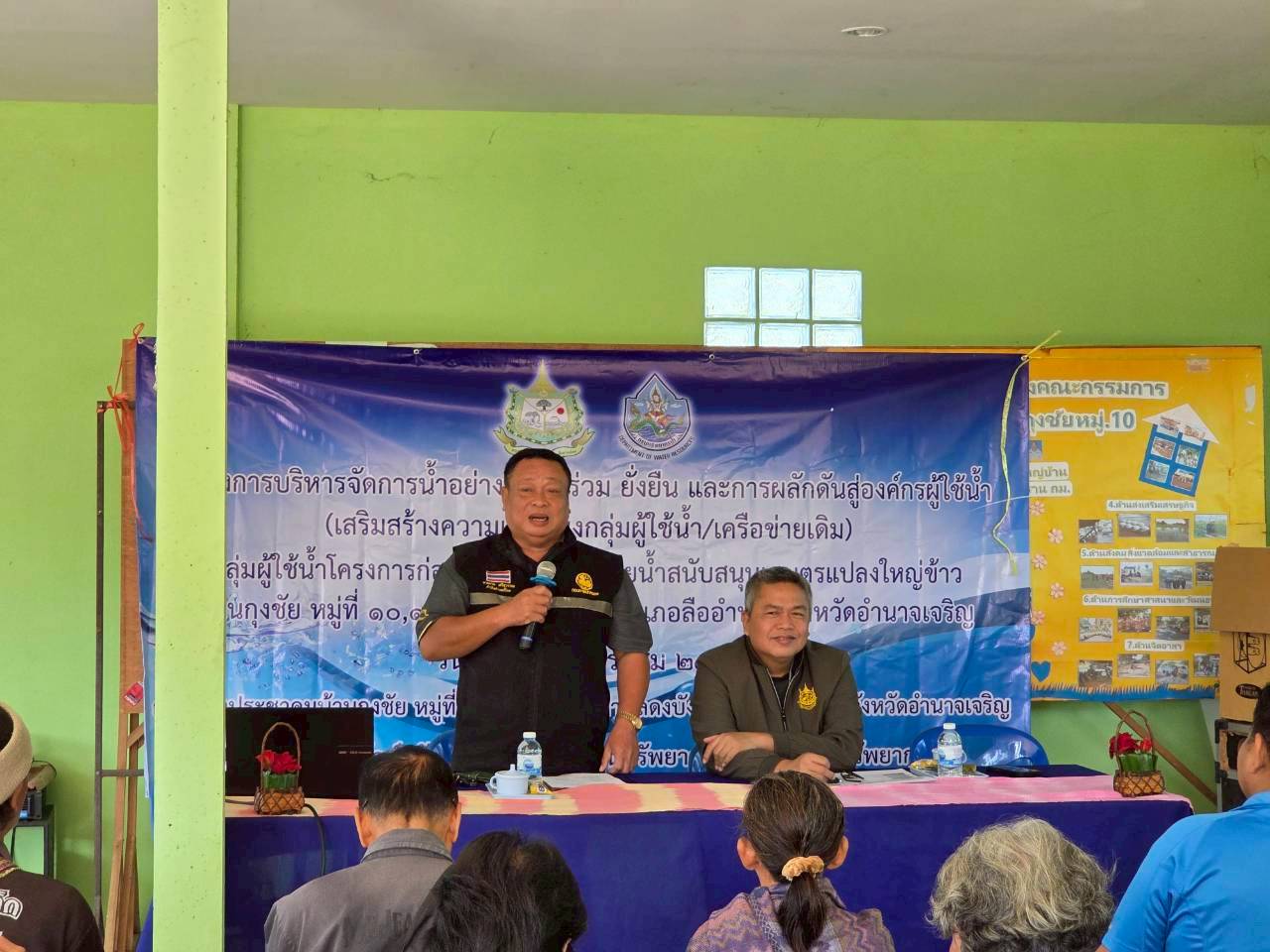 วันที่ 14 มกราคม 2569 นายโภคิน ช้ำเกตุ ผู้อำนวยการสำนักงานทรัพยากรน้ำที่ 11 มอบหมายให้ส่วนอนุรักษ์ทรัพยากรน้ำจัดโครงการบริหารจัดการน้ำเเละดูเเล รักษาอย่างมีส่วนร่วมเเละยั่งยืน (เสริมสร้างความเข้มเเข็งกลุ่มผู้ใช้น้ำ/เครือข่ายเดิม) ประจำปีงบประมาณ 2569 “โครงการก่อสร้างระบบกระจายน้ำสนับสนุน เกษตรแปลงใหญ่ข้าว บ้านกุงชัย หมู่ที่ 10, 11, 13 ตำบลดงบัง อำเภอลืออำนาจ จังหวัดอำนาจเจริญ” ณ ศาลาประชาคมบ้านกุงชัย หมู่ที่ 10 (แห่งที่ 2) โดยมี วิทยากรจากสำนักงานเกษตรอำเภอลืออำนาจ ร่วมบรรยายในหัวข้อ การปลูกพืช ใช้น้ำน้อย การปลูกพืชหลังฤดูปลูกข้าวนาปี และการทำน้ำหมักชีวภาพ พร้อมสาธิต การทำน้ำหมักชีวภาพ โดยมีวัตถุประสงค์เพื่อสนับสนุนกลุ่มเครือข่ายการบริหารจัดการ ทรัพยากรน้ำลดต้นทุนในการทำการเกษตร เสริมสร้างรายได้ในครัวเรือน ทั้งนี้มีผู้เข้าร่วมโครงการฯ จำนวน 58 ราย