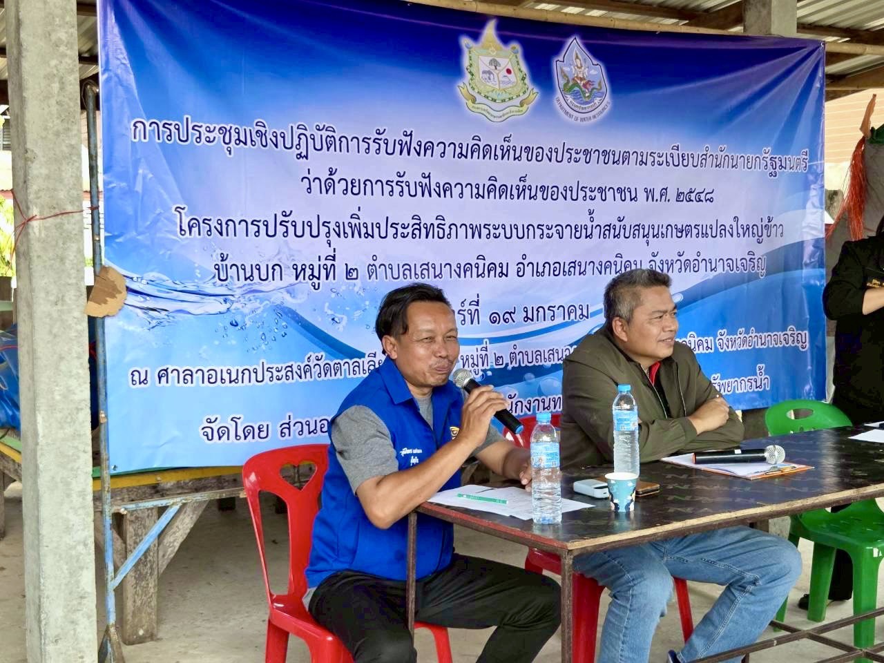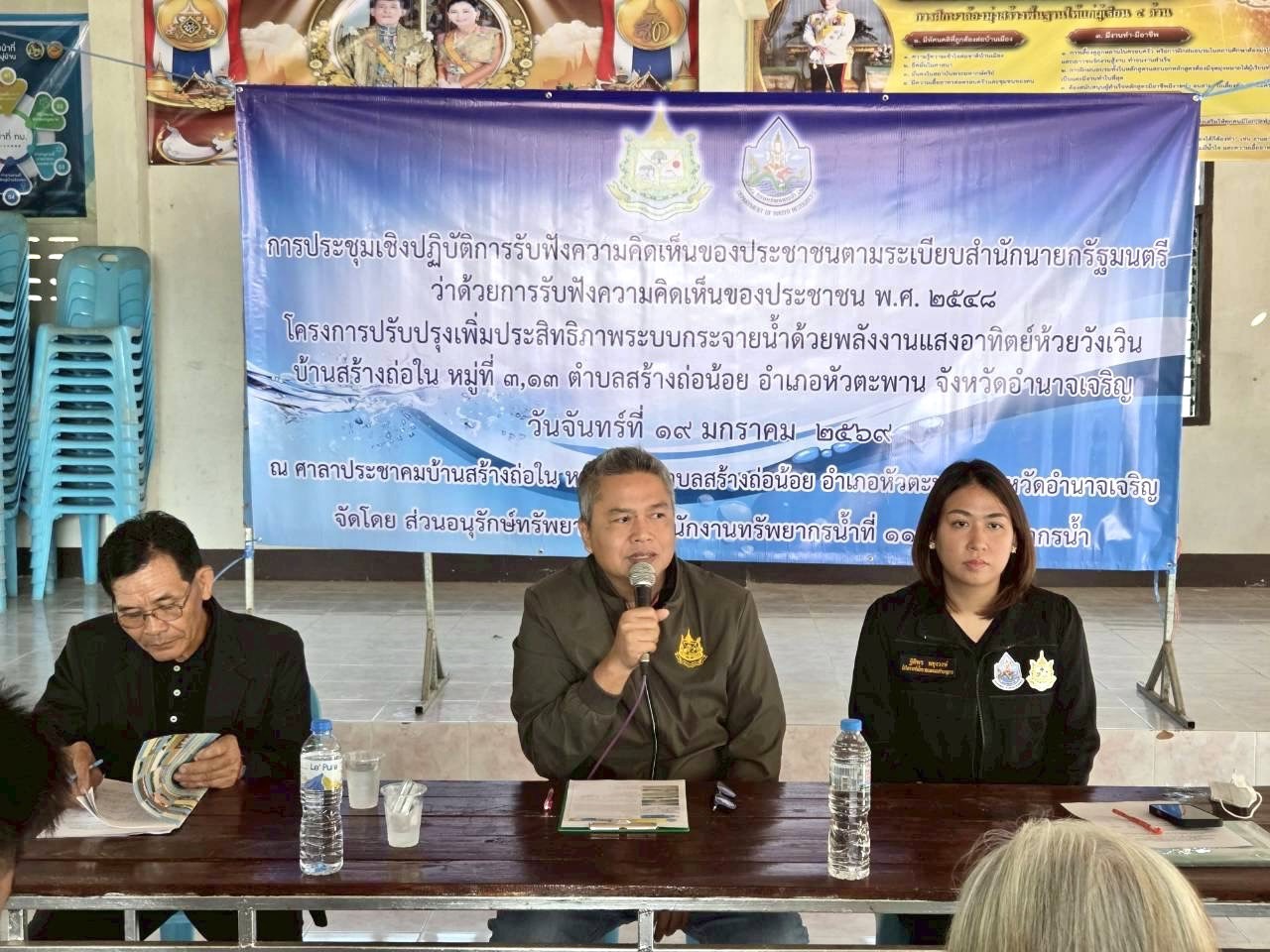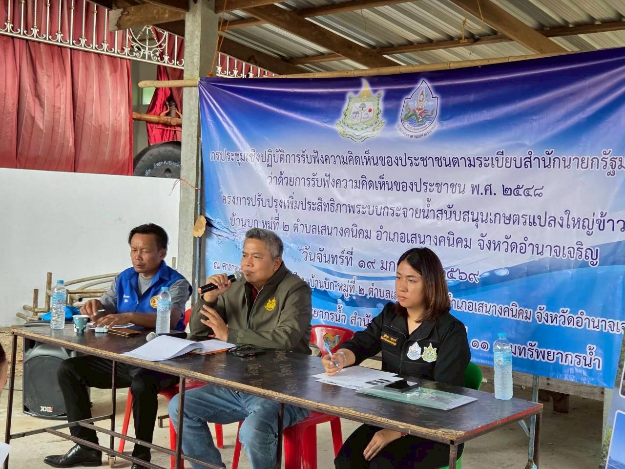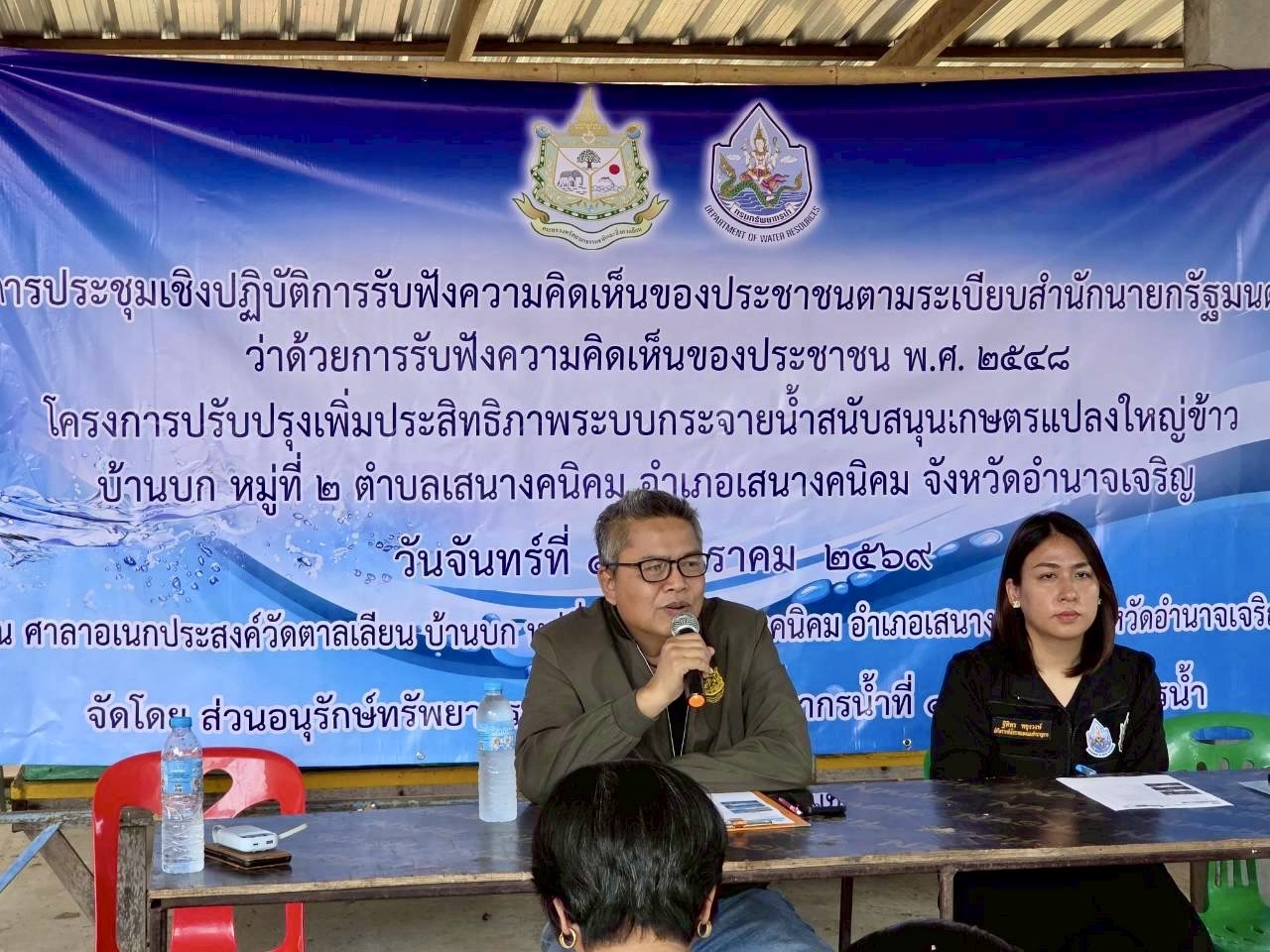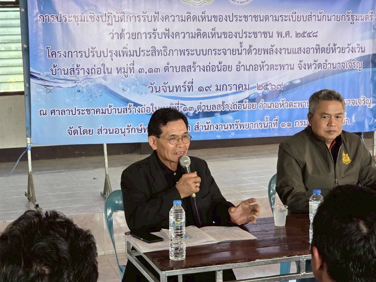 19 มกราคม 2569 นายโภคิน ช้ำเกตุ ผู้อำนวยการสำนักงานทรัพยากรน้ำที่ 11 มอบหมายให้ เจ้าหน้าที่ส่วนอนุรักษ์ทรัพยากรน้ำลงพื้นที่ จ. อำนาจเจริญ เพื่อจัดประชุมเชิงปฏิบัติการรับฟัง ความคิดเห็นของประชาชนตามระเบียบสำนักนายกรัฐมนตรีว่าด้วยการรับฟังความคิดเห็นของ ประชาชน พ.ศ. 2548 จำนวน 2 โครงการ ดังนี้ 1) “โครงการปรับปรุงเพิ่มประสิทธิภาพระบบ กระจายน้ำด้วยพลังงานแสงอาทิตย์ห้วยวังเวิน” บ.สร้างถ่อใน ม. 3, 13 ต.สร้างถ่อน้อย อ.หัวตะพาน จ.อำนาจเจริญ ณ ศาลาประชาคม บ.สร้างถ่อใน ม.13 มีประชาชนเข้าร่วมโครงการฯ จำนวน 35 ราย เเละ2) “โครงการปรับปรุงเพิ่มประสิทธิภาพระบบกระจายน้ำสนับสนุนเกษตรแปลงใหญ่ข้าว” บ.บก ม. 2 ต.เสนางคนิคม อ.เสนางคนิคม จ.อำนาจเจริญ ณ ศาลาศาลาอเนกประสงค์วัดตาลเลียน บ.บก ม. 2 มีประชาชนเข้าร่วมโครงการฯ จำนวน 43 ราย ทั้งนี้ มีการชี้แจงรายละเอียดเกี่ยวกับ โครงการของกรมทรัพยากรน้ำที่จะดำเนินการในพื้นที่ ซึ่งที่ประชุมฯ มีมติเห็นชอบ ให้ดำเนินการ โครงการฯ และให้ข้อคิดเห็นข้อเสนอแนะที่เป็นประโยชน์ โดยสำนักงานทรัพยากรน้ำที่ 11 จะนำ ข้อเสนอแนะและความต้องการของที่ประชุมไปพิจารณาดำเนินการเพื่อขอรับการสนับสนุน งบประมาณการก่อสร้างโครงการต่อไป