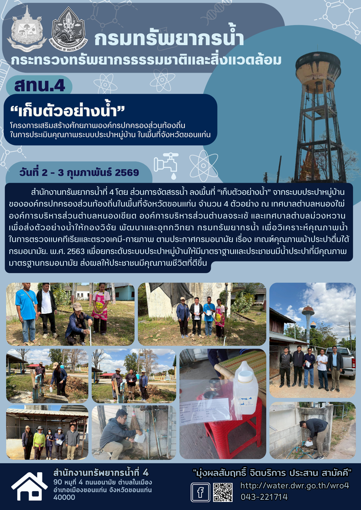 เมื่อวันที่ วันที่ 2 - 3 กุมภาพันธ์ 2569 สำนักงานทรัพยากรน้ำที่ 4 โดย ส่วนการจัดสรรน้ำ ลงพื้นที่ “เก็บตัวอย่างน้ำ” จากระบบประปาหมู่บ้านขององค์กรปกครองส่วนท้องถิ่นในพื้นที่จังหวัดขอนแก่น จำนวน 4 ตัวอย่าง ณ เทศบาลตำบลหนองไผ่ องค์การบริหารส่วนตำบลหนองเขียด องค์การบริหารส่วนตำบลจระเข้ และเทศบาลตำบลม่วงหวาน เพื่อส่งตัวอย่างน้ำให้กองวิจัย พัฒนาและอุทกวิทยา กรมทรัพยากรน้ำ เพื่อวิเคราะห์คุณภาพน้ำในการตรวจแบคทีเรียและตรวจเคมี-กายภาพ ตามประกาศกรมอนามัย เรื่อง เกณฑ์คุณภาพน้าประปาดื่มได้กรมอนามัย. พ.ศ. 2563 เพื่อยกระดับระบบประปาหมู่บ้านให้มีมาตราฐานและประชาชนมีน้ำประปาที่มีคุณภาพมาตรฐานกรมอนามัย ส่งผลให้ประชาชนมีคุณภาพชีวิตที่ดีขึ้น