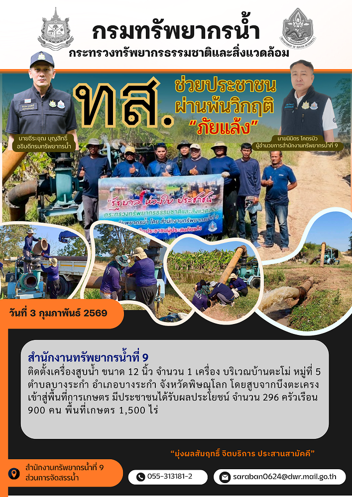 สำนักงานทรัพยากรน้ำที่ 9 ติดตั้งเครื่องสูบน้ำ ขนาด 12 นิ้ว จำนวน 1 เครื่อง บริเวณบ้านตะโม่ หมู่ที่ 5 ตำบลบางระกำ อำเภอบางระกำ จังหวัดพิษณุโลก โดยสูบจากบึงตะเครง เข้าสู่พื้นที่การเกษตร มีประชาชนได้รับผลประโยชน์ จำนวน 296 ครัวเรือน 900 คน พื้นที่เกษตร 1,500 ไร่