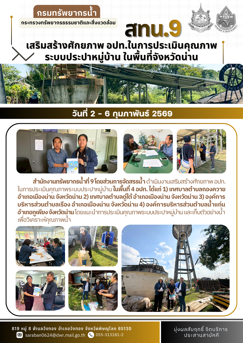 วันที่ 2 - 6 กุมภาพันธ์ 2569 สำนักงานทรัพยากรน้ำที่ 9 โดยส่วนการจัดสรรน้ำ ดำเนินงานเสริมสร้างศักยภาพ อปท. ในการประเมินคุณภาพระบบประปาหมู่บ้าน ในพื้นที่ 4 อปท. ได้แก่ 1) เทศบาลตำบลกองควาย อำเภอเมืองน่าน จังหวัดน่าน 2) เทศบาลตำบลดู่ใต้ อำเภอเมืองน่าน จังหวัดน่าน 3) องค์การบริหารส่วนตำบลเรือง อำเภอเมืองน่าน จังหวัดน่าน 4) องค์การบริหารส่วนตำบลน้ำแก่น อำเภอภูเพียง จังหวัดน่าน โดยแนะนำการประเมินคุณภาพระบบประปาหมู่บ้าน และเก็บตัวอย่างน้ำ เพื่อวิเคราะห์คุณภาพน้ำ