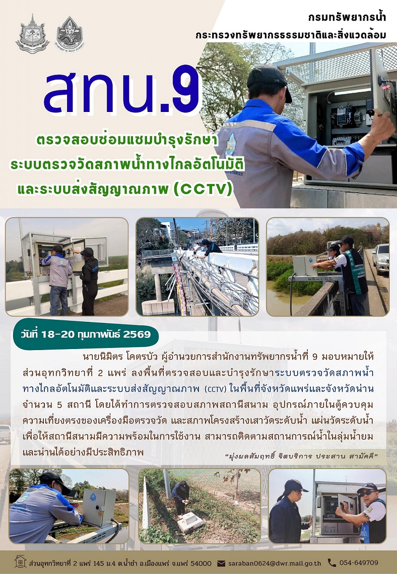 นายนิมิตร โคตรบัว ผู้อำนวยการสำนักงานทรัพยากรน้ำที่ 9 มอบหมายให้ ส่วนอุทกวิทยาที่ 2 แพร่ ลงพื้นที่ตรวจสอบ บำรุงรักษาระบบตรวจวัดสภาพน้ำทางไกลอัตโนมัติและระบบส่งสัญญาณภาพ (CCTV) ในพื้นที่จังหวัดแพร่และจังหวัดน่าน จำนวน 5 สถานี โดยได้ทำการตรวจสอบสภาพสถานีสนาม อุปกรณ์ภายในตู้ควบคุม ความเที่ยงตรงของเครื่องมือตรวจวัดและสภาพโครงสร้างเสาวัดระดับน้ำ แผ่นวัดระดับน้ำ เพื่อให้สถานีสนามมีความพร้อมในการใช้งาน สามารถติดตามสถานการณ์น้ำในลุ่มน้ำยมและน่านได้อย่างมีประสิทธิภาพ