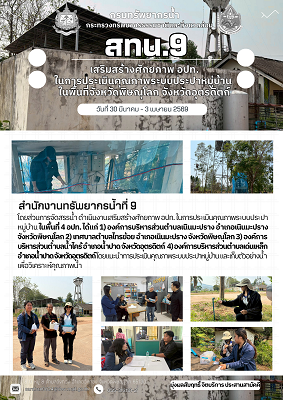 วันที่ 30 มีนาคม - 3 เมษายน 2569 สำนักงานทรัพยากรน้ำที่ 9 โดยส่วนการจัดสรรน้ำ ดำเนินงานเสริมสร้างศักยภาพ อปท. ในการประเมินคุณภาพระบบประปาหมู่บ้าน ในพื้นที่ 4 อปท. ได้แก่ 1) องค์การบริหารส่วนตำบลเนินมะปราง อำเภอเนินมะปรางจังหวัดพิษณุโลก 2) เทศบาลตำบลไทรย้อย อำเภอเนินมะปราง จังหวัดพิษณุโลก 3) องค์การบริหารส่วนตำบลน้ำไคร้ อำเภอน้ำปาด จังหวัดอุตรดิตถ์ 4) องค์การบริหารส่วนตำบลเด่นเหล็ก อำเภอน้ำปาด จังหวัดอุตรดิตถ์ โดยแนะนำการประเมินคุณภาพระบบประปาหมู่บ้าน และเก็บตัวอย่างน้ำ เพื่อวิเคราะห์คุณภาพน้ำ