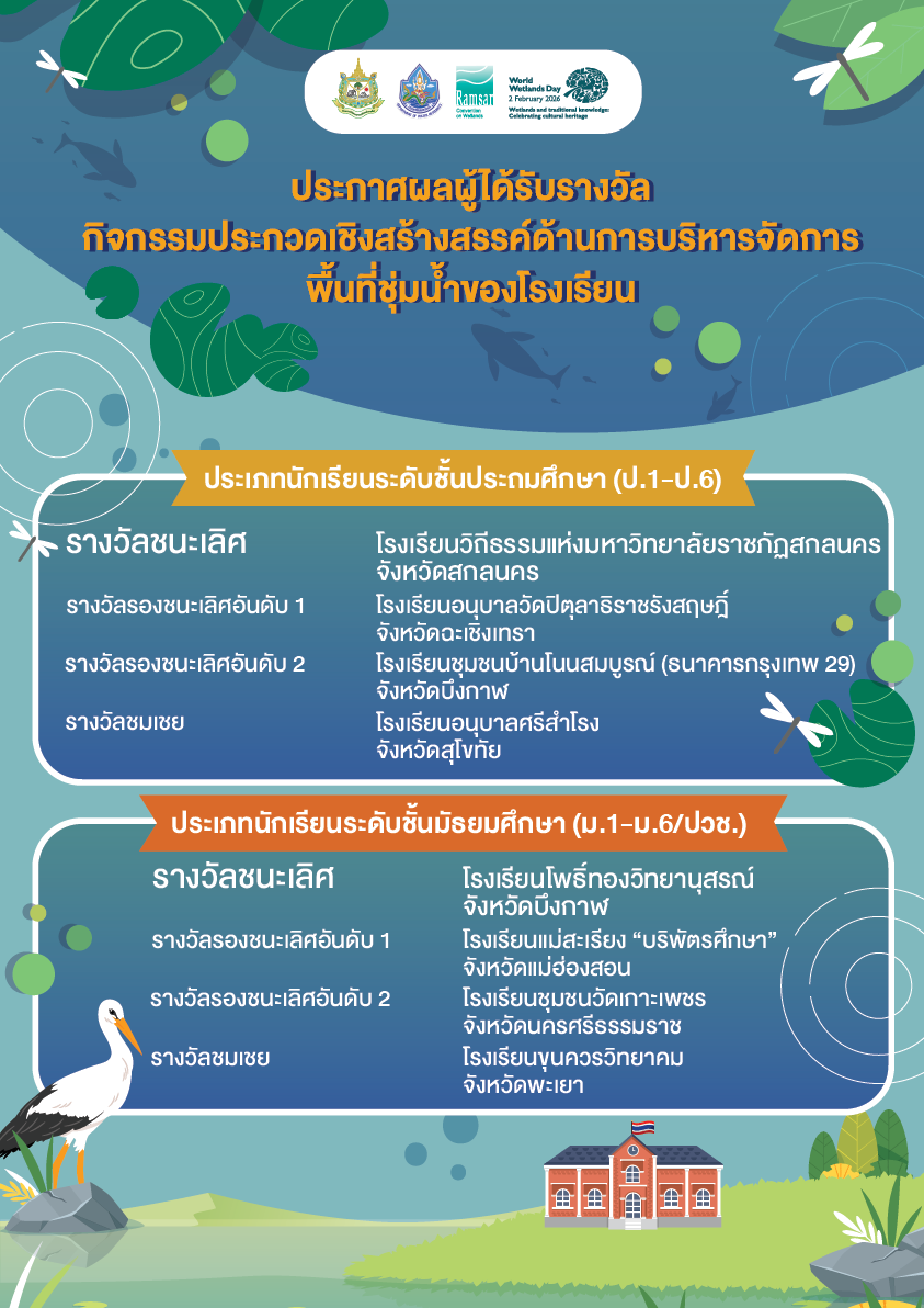 ประกาศผลผู้ได้รับรางวัลกิจกรรมประกวดเชิงสร้างสรรค์ด้านการบริหารจัดการพื้นที่ชุ่มน้ำของโรงเรียน