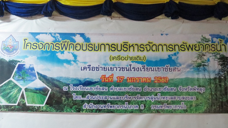 วันที่ 17 มกราคม 2560 ส่วนประสานและบริหารจัดการลุ่มน้ำทะเลสาบสงขลา โดยนายสัมพันธ์ ดุลยาภรณ์ ผู้อำนวยการส่วนประสานและบริหารจัดการลุ่มน้ำทะเลสาบสงขลา พร้อมเจ้าหน้าที่จัดโครงการฝึกอบรมการบริหารจัดการทรัพยากรน้ำ (เครือข่ายเดิม) เครือข่ายเยาวชนโรงเรียนเขาชัยสน ณ โรงเรียนเขาชัยสน ตำบลเขาชัยสน อำเภอเขาชัยสน จังหวัดพัทลุง ผู้เข้าร่วมโครงการประกอบด้วย กลุ่มเครือข่ายโรงเรียนเขาชัยสน จำนวนทั้งสิ้น 87 คน การจัดโครงการดังกล่าวมีการบรรยายให้ความรู้เรื่องการบริหารจัดการทรัพยากรน้ำ โดยนายสัมพันธ์ ดุลยาภรณ์ ผู้อำนวยการส่วนประสานและบริหารจัดการลุ่มน้ำทะเลสาบสงขลา, ระบบเตือนภัยล่วงหน้า (Early Warning) โดยนายธีระนนท์ ศรีเกื้อ นักอุทกวิทยาปฏิบัติงาน และเจ้าหน้าที่จากส่วนอุทกวิทยา สำนักงานทรัพยากรน้ำภาค 8 ,แบ่งกลุ่มระดมความคิดเห็น การแก้ไขปัญหาทรัพยากรธรรมชาติและสิ่งแวดล้อมในพื้นที่และการอนุรักษ์ทรัพยากรน้ำ โดยเจ้าหน้าที่ส่วนประสานและบริหารจัดการลุ่มน้ำทะเลสาบสงขลา