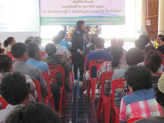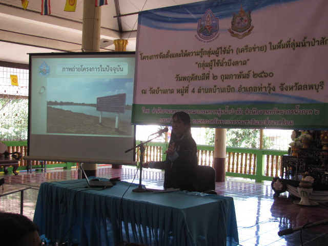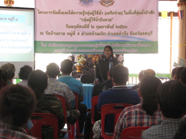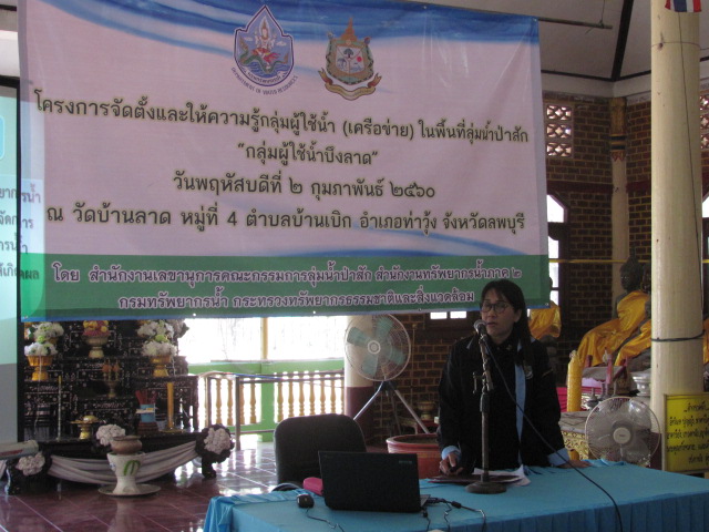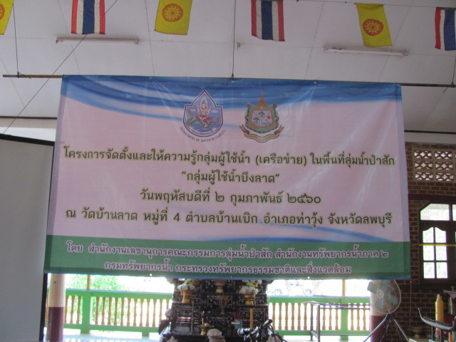 นายเอนก ชมพานิชย์ ผู้อำนวยการสำนักงานทรัพยากรน้ำภาค 2 มอบหมายให้ นางจารุทรรศน์ สื่อประเสริฐสุข ผู้อำนวยการส่วนประสานและบริหารจัดการลุ่มน้ำป่าสัก พร้อมเจ้าหน้าที่ ดำเนินโครงการจัดตั้งและให้ความรู้กลุ่มผู้ใช้น้ำ (เครือข่าย) ในวันพฤหัสบดีที่ 2 กุมภาพันธ์ 2560 เวลา 08.30 - 16.30 น. ณ วัดบ้านลาด หมู่ที่ 4ตำบลบ้านเบิก อำเภอท่าวุ้ง จังหวัดลพบุรี