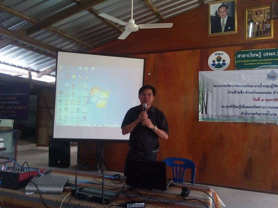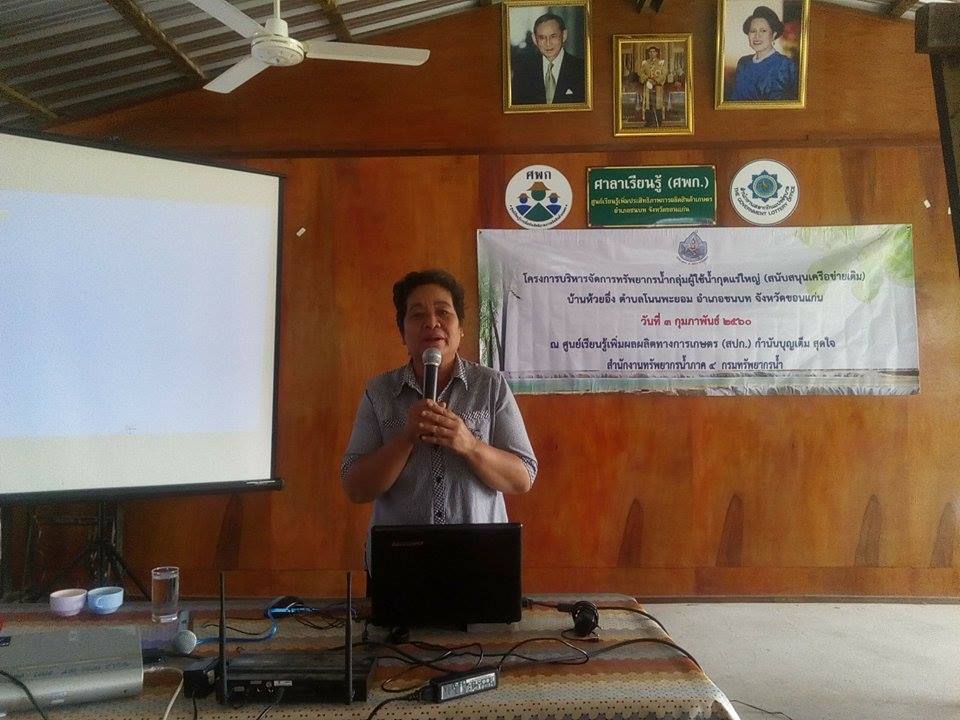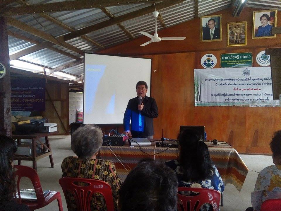วันที่ ๓ กุมภาพันธ์ ๒๕๖๐ ส่วนประสานและบริหารจัดการลุ่มน้ำชีตอนบนจัดโครงการสนับสนุนเครือข่ายกลุ่มผู้ใช้น้ำ “กุดแร่ใหญ่” บ้านห้วยอึ่ง ต.โนนพยอม อ.ชนบท จ.ขอนแก่น ณ ศูนย์เรียนรู้เพิ่มประสิทธิภาพการผลิตสินค้าการเกษตร (บ้านกำนันบุญเต็ม สุดใจ)