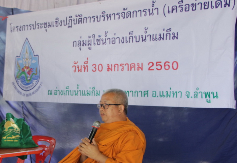 วันที่ 30 มกราคม 2560 ส่วนประสานและบริหารจัดการลุ่มน้ำปิงตอนบน สำนักงานทรัพยากรน้ำภาค 1 จัดประชุมเชิงปฏิบัติการบริหารจัดการน้ำ(เครือข่ายเดิม) ลุ่มน้ำสาขาแม่กวง กลุ่มผู้ใช้น้ำอ่างเก็บน้ำแม่กึม ณ อ่างเก็บน้ำแม่กึม หมู่ 1 ตำบลทากาศ อำเภอแม่ทา จังหวัดลำพูน