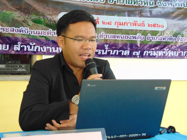 สำนักงานทรัพยากรน้ำภาค ๗ โดยส่วนประสานและบริหารจัดการลุ่มน้ำเพชรบุรีและประจวบคีรีขันธ์ จัดโครงการจัดตั้งและให้ความรู้กลุ่มผู้ใช้น้ำ(เครือข่าย) กลุ่มผู้ใช้น้ำอ่างเก็บน้ำลำห้วยหินดำหมู่ที่ ๕ ตำบลหนองพลับ อำเภอหัวหิน จังหวัดประจวบคีรีขันธ์ วันอังคารที่ ๒๘ กุมภาพันธ์ ๒๕๖๐ณ ศาลาอเนกประสงค์บ้านมะค่าสี่ซอง หมู่ที่ ๕ ตำบลหนองพลับ อำเภอหัวหิน จังหวัดประจวบคีรีขันธ์ โดยมีนายเภาพงศ์ หอยทอง นักวิชาการสิ่งแวดล้อมปฏิบัติการ สำนักงานทรัพยากรธรรมชาติและสิ่งแวดล้อมจังหวัดประจวบคีรีขันธ์ บรรยายเรื่อง “บทบาทหน้าที่ของอาสาสมัครพิทักษ์ทรัพยากรธรรมชาติและสิ่งแวดล้อมหมู่บ้าน(ทสม.)” นายธันยา จรูญสมาธิศักดิ์ นักวิเคราะห์นโยบายและแผนชำนาญการ สำนักงานทรัพยากรน้ำภาค ๗ บรรยายเรื่อง “การดูแลบำรุงรักษาแหล่งน้ำ” นายเชตุ จันทร์ถิ นักวิเคราะห์นโยบายและแผนชำนาญการสำนักงานทรัพยากรน้ำภาค ๗ บรรยายเรื่อง “ศาสตร์พระราชาสู่การร่วมคิดร่วมทำร่วมตัดสินใจพัฒนาบริหารจัดการน้ำอย่างยั่งยืน แนวทางในการกำหนด กฎ กติกา และแผนการทำกิจกรรมของกลุ่มผู้ใช้น้ำ” และนายยุทธพล วรรณโก นักวิเคราะห์นโยบายและแผนชำนาญการ สำนักงานทรัพยากรน้ำภาค ๗ บรรยายเรื่อง“บทบาทหน้าที่ของกลุ่มผู้ใช้น้ำกับการบริหารจัดการทรัพยากรน้ำในพื้นที่” ผู้เข้าร่วมโครงการ จำนวน ๑๗๙ คน