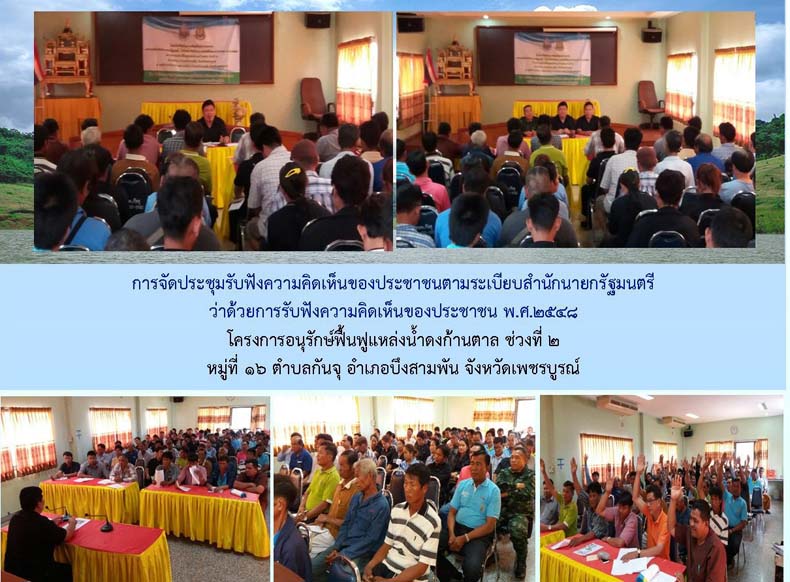 ในระหว่างวันที่ 15 - 17 มีนาคม 2560 นายเอนก ชมพานิชย์ ผู้อำนวยการสำนักงานทรัพยากรน้ำภาค 2 มอบหมายให้นางจารุทรรศน์ สื่อประเสริฐสุข ผู้อำนวยการส่วนประสานและบริหารจัดการลุ่มน้ำป่าสัก พร้อมด้วยเจ้าหน้าที่ ดำเนินการจัดประชุมรับฟังความคิดเห็นของประชาชนตามระเบียบสำนักนายกรัฐมนตรี ว่าด้วยการรับฟังความคิดเห็นของประชาชน พ.ศ. 2548 จังหวัดเพชรบูรณ์ โดยมีวัตถุประสงค์