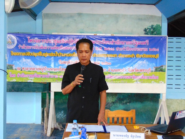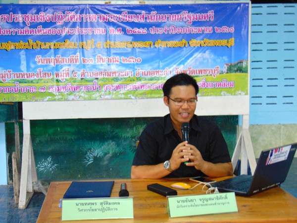สำนักงานทรัพยากรน้ำภาค ๗ โดยส่วนประสานและบริหารจัดการลุ่มน้ำเพชรบุรีและประจวบคีรีขันธ์ และส่วนพัฒนาและฟื้นฟูแหล่งน้ำ จัดโครงการประชุมเชิงปฏิบัติการตามระเบียบสำนักนายกรัฐมนตรี ว่าด้วยการรับฟังความคิดเห็นของประชาชน พ.ศ. ๒๕๔๘ ปีงบประมาณ 2561 โครงการปรับปรุงฟื้นฟูแหล่งน้ำบ้านหนองโสน ม.5 ต.สามพระยา อ.ชะอำ จ.เพชรบุรี วันพฤหัสบดีที่ 23 มีนาคม 2560 ณ ศาลากลางหมู่บ้านหนองโสน ม.5 ต.สามพระยา อ.ชะอำ จ.เพชรบุรี โดยมี นายทรงรัฐ รัฐปัตย์ นายอำเภอชะอำ เป็นประธานและบรรยายเรื่องการบริหารจัดการทรัพยากรน้ำในพื้นที่อย่างยั่งยืน นายมนตรี โภโค นายช่างโยธาชำนาญงาน กล่าวรายงาน นายธันยา จรูญสมาธิศักดิ์ นักวิเคราะห์นโยบายและแผนชำนาญการ ชี้แจงวัตถุประสงค์โครงการตามระเบียบสำนักนายกรัฐมนตรีฯ นายทศพร สุรัติมงคล วิศวกรโยธาปฏิบัติการ ชี้แจงรายละเอียดการดำเนินโครงการฯ โดยที่ประชุมมีมติเห็นชอบให้ดำเนินการโครงการปรับปรุงฟื้นฟู แหล่งน้ำบ้านหนองโสน ม.5 ต.สามพระยา อ.ชะอำ จ.เพชรบุรี มีผู้เข้าร่วมประชุมประกอบด้วย ประชาชน ในพื้นที่ ผู้นำชุมชน หน่วยงานราชการที่เกี่ยวข้อง และเจ้าหน้าที่ รวมจำนวน 79 คน