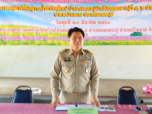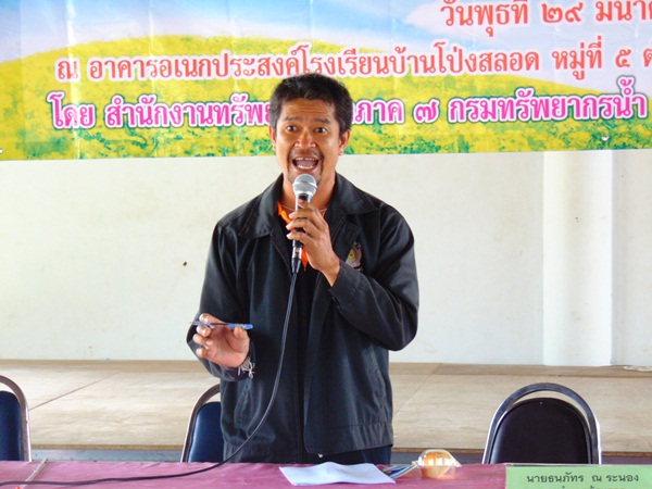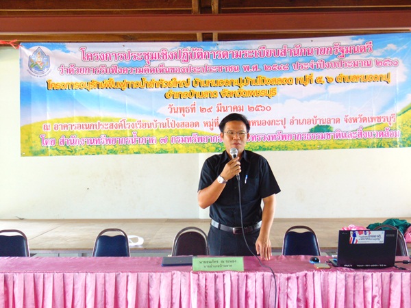 สำนักงานทรัพยากรน้ำภาค ๗ โดยส่วนประสานและบริหารจัดการลุ่มน้ำเพชรบุรีและประจวบคีรีขันธ์ และส่วนพัฒนาและฟื้นฟูแหล่งน้ำ จัดโครงการประชุมเชิงปฏิบัติการตามระเบียบสำนักนายกรัฐมนตรี ว่าด้วยการรับฟังความคิดเห็นของประชาชน พ.ศ. ๒๕๔๘ ปีงบประมาณ 2561 โครงการอนุรักษ์ฟื้นฟูทางน้ำลำห้วยใหญ่ บ้านหนองกะปุ,บ้านโป่งสลอด หมู่ที่ 5,6 ต.หนองกะปุ อ.บ้านลาด จ.เพชรบุรี วันพุธที่ 29 มีนาคม 2560 ณ อาคารอเนกประสงค์โรงเรียนบ้านโป่งสลอด ม.5 ต.หนองกะปุ อ.บ้านลาด จ.เพชรบุรี โดยมี นายธนภัทร ณ ระนอง นายอำเภอบ้านลาด เป็นประธานและบรรยายเรื่องการบริหาร จัดการทรัพยากรน้ำในพื้นที่อย่างยั่งยืน นายมนตรี โภโค นายช่างโยธาชำนาญงาน กล่าวรายงาน นายธันยา จรูญสมาธิศักดิ์ นักวิเคราะห์นโยบายและแผนชำนาญการ ชี้แจงวัตถุประสงค์โครงการตามระเบียบสำนักนายกรัฐมนตรีฯ นายเกียรติ สุทโธ วิศวกรโยธาปฏิบัติการ ชี้แจงรายละเอียดการดำเนินโครงการฯ โดยที่ประชุมมีมติเห็นชอบให้ดำเนินการ โครงการอนุรักษ์ฟื้นฟูทางน้ำลำห้วยใหญ่ บ้านหนองกะปุ,บ้านโป่งสลอด หมู่ที่ 5,6 ต.หนองกะปุ อ.บ้านลาด จ.เพชรบุรี มีผู้เข้าร่วมประชุมประกอบด้วย ประชาชนในพื้นที่ ผู้นำชุมชน หน่วยงานราชการที่เกี่ยวข้อง และเจ้าหน้าที่ รวมจำนวน 84 คน