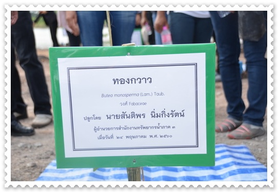 เมื่อวันพุธที่ ๒๔ พฤษภาคม ๒๕๖๐ เวลา ๐๙.๐๐ น. นายสันติพร นิ่มกิ่งรัตน์ ผู้อำนวยการสำนักงานทรัพยากรน้ำภาค ๓ นำคณะข้าราชการ ลูกจ้างประจำ พนักงานราชการ และเจ้าหน้าที่เข้าร่วมปลูกป่าโครงการปลูกป่าประชารัฐร่วมใจเนื่องในวันต้นไม้ประจำปีของชาติ ประจำปี พ.ศ. ๒๕๖๐ ร่วมกับจังหวัดอุดรธานี ส่วนราชการต่าง ๆ และชุมชนในพื้นที่ ณ บริเวณโครงการอนุรักษ์ฟื้นฟูแหล่งน้ำหนองตะไก้ ตำบลหนองบัว อำเภอเมือง จังหวัดอุดรธานี ปลูกต้นทองกวาวจำนวน ๒,๐๐๐ ต้น บนเนื้อที่ ๑๐ ไร่ โดยมี นายสมหวัง พ่วงบางโพ รองผู้ว่าราชการจังหวัดอุดรธานี เป็นประธานในพิธี