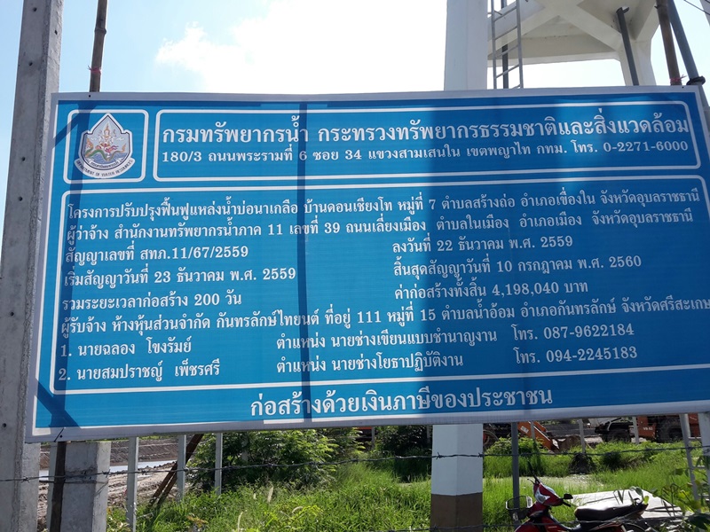 เมื่อวันที่ 8 มิถุนายน 2560 นายเดชา สินเติม นักวิเคราะห์นโยบายและแผนชำนาญการพิเศษ รักษาราชการแทนผู้อำนวยการสำนักงานทรัพยากรน้ำภาค 11 พร้อมด้วยนายโยธิน พงษ์ศิริ ผู้อำนวยการส่วนพัฒนาและฟื้นฟูแหล่งน้ำ เจ้าหน้าที่ส่วนพัฒนาและฟื้นฟูแหล่งน้ำที่เกี่ยวข้อง และผู้รับจ้างร่วมกันติดตามความก้าวหน้าโครงการปรับปรุงฟื้นฟูแหล่งน้ำบ่อนาเกลือ บ้านดอนเชียงโท หมู่ 7 ตำบลสร้างถ่อ อำเภอเขื่องใน จังหวัดอุบลราชธานี ก่อสร้างปีงบประมาณ พ.ศ. 2560 ผลงานสะสมปัจจุบัน ร้อยละ 75 ทั้งนี้ เพื่อติดตาม ตรวจสอบ เร่งรัดผลการดำเนินงานโครงการ ให้สามารถใช้งานได้ตามวัตถุประสงค์ ต่อไป
