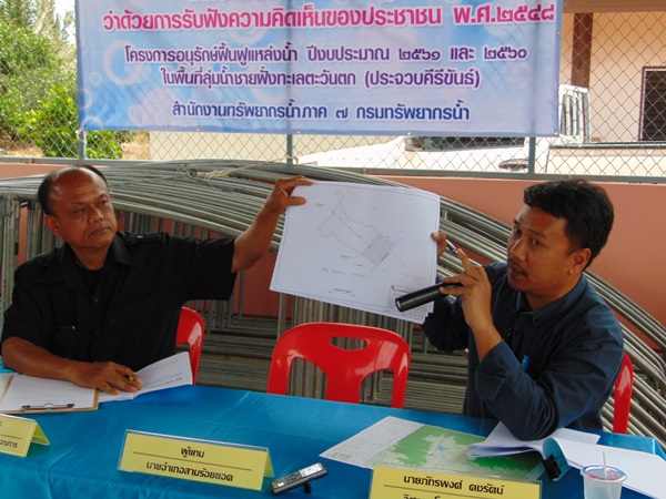 สำนักงานทรัพยากรน้ำภาค ๗ โดยส่วนประสานและบริหารจัดการลุ่มน้ำเพชรบุรีและประจวบคีรีขันธ์ จัดประชุมเชิงปฏิบัติการรับฟังความคิดเห็นตามระเบียบสำนักนายกรัฐมนตรี ว่าด้วยการรับฟังความคิดเห็นของประชาชน พ.ศ. ๒๕๔๘ โครงการอนุรักษ์ฟื้นฟูแหล่งน้ำ ประจำปีงบประมาณ ๒๕๖๑ โครงการอนุรักษ์ฟื้นฟูแหล่งน้ำอ่างเก็บน้ำชุมนุมกระดาน บ้านหนองจิก หมู่ที่ ๔ ตำบลไร่ใหม่ อำเภอสามร้อยยอดจังหวัดประจวบคีรีขันธ์ ณ ศาลาอเนกประสงค์บ้านหนองจิก หมู่ที่ ๔ ตำบลไร่ใหม่ อำเภอสามร้อยยอด จังหวัดประจวบคีรีขันธ์ วันจันทร์ที่ ๑๒ มิถุนายน ๒๕๖๐ เวลา ๑๓.๐๐ น. โดยมี นายณัฐพล เรืองฤทธิ์ ปลัดอำเภอสามร้อยยอด ให้เกียรติร่วมประชุมรับฟัง นายเชตุ จันทร์ถิ นักวิเคราะห์นโยบายและแผนชำนาญการ ชี้แจงเหตุผลความจำเป็นและวัตถุประสงค์ของการรับฟังความคิดเห็นของประชาชนตามระเบียบสำนักนายกรัฐมนตรีฯ และนายภัทรพงศ์ คชรัตน์ วิศวกรโยธาปฏิบัติการ ชี้แจงรายละเอียดโครงการ ผู้เข้าร่วมการประชุม จำนวน ๕๖ คน ที่ประชุมมีมติเห็นชอบให้ดำเนินโครงการ
