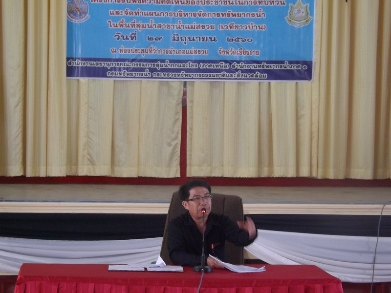 สำนักงานทรัพยากรน้ำภาค 1 โดยส่วนประสานและบริหารจัดการลุ่มน้ำกกและโขง (ภาคเหนือ) จัดประชุมรับฟังความคิดเห็นของประชาชน ในการทบทวนและจัดทำแผนการบริหารจัดการทรัพยากรน้ำ (เวทีชาวบ้าน) ในพื้นที่ลุ่มน้ำสาขาน้ำแม่สรวย ในวันที่ 29 มิถุนายน พ.ศ. 2560 เวลา 08.30 – 16.30 น. ณ หอประชุมที่ว่าการอำเภอแม่สรวย จังหวัดเชียงราย โดยมีนายณรงค์ ซาวคำเขต ปลัดอาวุโสอำเภอแม่สรวย เป็นประธาน มีผู้เข้าร่วมประกอบด้วย ผู้แทนองค์กรปกครองส่วนท้องถิ่น ผู้นำชุมชน ตัวแทนกลุ่มผู้ใช้น้ำในพื้นที่ลุ่มน้ำสาขาน้ำแม่สรวย เข้าร่วมประชุมจำนวน 75 คน
