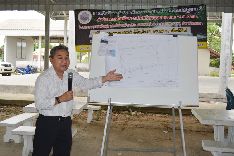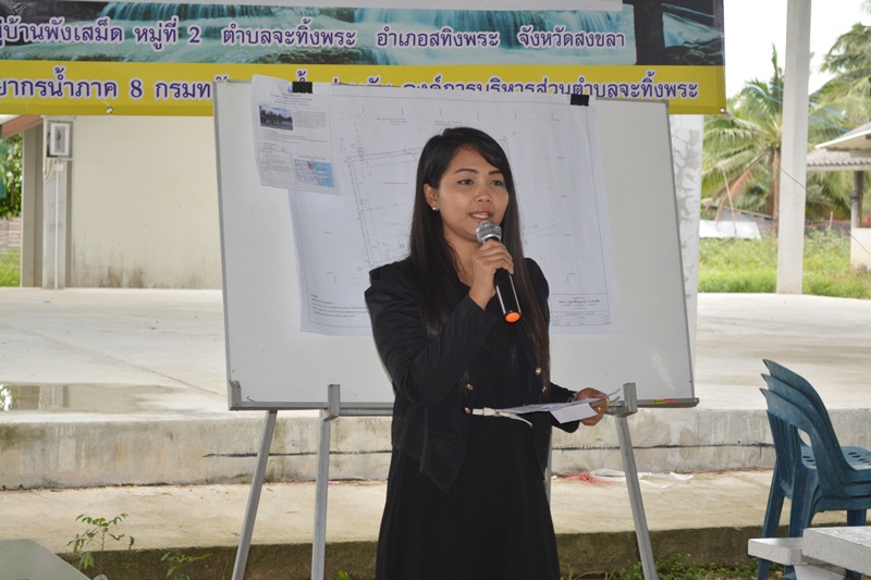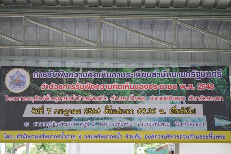 วันที่ 7 กรกฎาคม 2560 ส่วนประสานและบริหารจัดการลุ่มน้ำทะเลสาบสงขลา โดยนายสัมพันธ์ ดุลยาภรณ์ ผู้อำนวยการส่วนประสานและบริหารจัดการลุ่มน้ำทะเลสาบสงขลา พร้อมเจ้าหน้าที่จัดโครงการการรับฟังความคิดเห็นตามระเบียบสำนักนายกรัฐมนตรีฯ พ.ศ.2548 ในพื้นที่จังหวัดสงขลา โครงการอนุรักษ์ฟื้นฟูแหล่งน้ำบ้านพังเสม็ด ตำบลจะทิ้งพระ อำเภอสทิงพระ จังหวัดสงขลา ได้รับเกียรติจากนางสาวสนธยา ราชสีห์ ปลัดอำเภอสทิงพระ เป็นประธานเปิดโครงการฯ ณ ศาลาหมู่บ้านพังเสม็ด หมู่ที่ 2 ตำบลจะทิ้งพระ อำเภอสทิงพระ จังหวัดสงขลา ผู้เข้าร่วมโครงการประกอบด้วย ประชาชน ผู้มีส่วนได้ส่วนเสีย องค์กรปกครองส่วนท้องถิ่น ผู้สังเกตการณ์ และเจ้าหน้าที่สำนักงานทรัพยากรน้ำภาค 8 จำนวนทั้งสิ้น 63 คน วิทยากรบรรยายโดยนายบุญเพิ่ม ทองรัตน์ นายช่างโยธาอาวุโส และเจ้าหน้าที่จากส่วนพัฒนาและฟื้นฟูแหล่งน้ำ