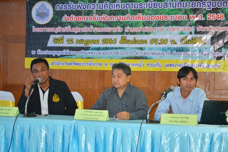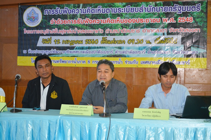 วันที่ 12 กรกฎาคม 2560 ส่วนประสานและบริหารจัดการลุ่มน้ำทะเลสาบสงขลา โดยนายสัมพันธ์ ดุลยาภรณ์ ผู้อำนวยการส่วนประสานและบริหารจัดการลุ่มน้ำทะเลสาบสงขลา พร้อมเจ้าหน้าที่จัดโครงการการรับฟังความคิดเห็นตามระเบียบสำนักนายกรัฐมนตรีฯ พ.ศ.2548 ในพื้นที่จังหวัดสงขลา โครงการอนุรักษ์ฟื้นฟูแหล่งน้ำคลองเขาแก้ว ตำบลปาดังเบซาร์ อำเภอสะเดา จังหวัดสงขลา ได้รับเกียรติจากนายพัฒนา ฤทธิณรงค์ ปลัดเทศบาล ปฏิบัติหน้าที่นายกเทศมนตรีเมืองปาดังเบซาร์ เป็นประธานเปิดโครงการฯ ณ ห้องประชุมศูนย์พัฒนาอาชีพเทศบาลเมืองปาดังเบซาร์ ตำบลปาดังเบซาร์ จังหวัดสงขลา ผู้เข้าร่วมโครงการประกอบด้วย ประชาชน ผู้มีส่วนได้ส่วนเสีย องค์กรปกครองส่วนท้องถิ่น ผู้สังเกตการณ์ และจ้าหน้าที่สำนักงานทรัพยากรน้ำภาค 8 จำนวนทั้งสิ้น 80 คน วิทยากรบรรยายโดยนายบุญเพิ่ม ทองรัตน์ นายช่างโยธาอาวุโส และเจ้าหน้าที่จากส่วนพัฒนาและฟื้นฟูแหล่งน้ำ
