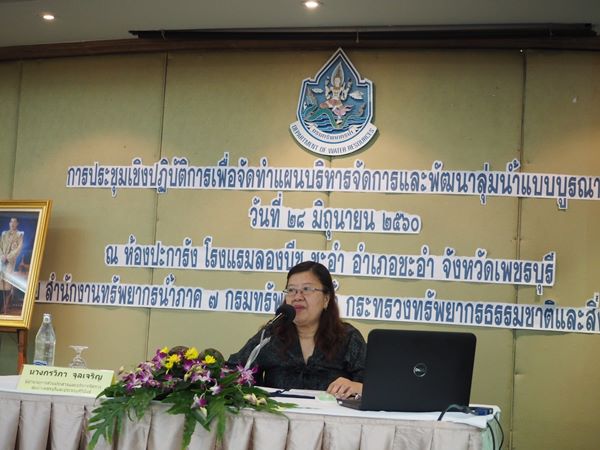สำนักงานทรัพยากรน้ำภาค ๗ โดยส่วนประสานและบริหารจัดการลุ่มน้ำเพชรบุรีและประจวบคีรีขันธ์ ได้ดำเนินการจัดโครงการประชุมเชิงปฏิบัติการเพื่อจัดทำแผนบริหารจัดการและพัฒนาลุ่มน้ำแบบบูรณาการ วันพุธที่ ๒๘ มิถุนายน ๒๕๖๐ ณ ห้องปะการัง โรงแรมลองบีช ชะอำ จังหวัดเพชรบุรี โดยมี นางกรวิภา จุลเจริญ ผู้อำนวยการส่วนประสานและบริหารจัดการลุ่มน้ำเพชรบุรีและประจวบคีรีขันธ์ เป็นประธานเปิดโครงการ นายมนตรี โภโค นายช่างโยธาชำนาญงาน เป็นวิทยากรบรรยายเรื่อง แนวทางการจัดทำแผนบริหารจัดการทรัพยากรน้ำแบบบูรณาการปี ๒๕๖๒ การเชื่อมโยงยุทธศาสตร์ชาติสู่ยุทธศาสตร์จังหวัด เจ้าหน้าที่จากสำนักงานทรัพยากรน้ำภาค ๗ เป็นวิทยากร แบ่งกลุ่มเพื่อพิจารณาเป้าหมายเชิงพื้นที่ แนวทางการดำเนินงานตามแผนความต้องการเร่งด่วนในพื้นที่ลุ่มน้ำเพชรบุรี ผู้เข้าร่วมโครงการประกอบด้วย ผู้แทนองค์กรปกครองส่วนท้องถิ่นและส่วนราชการ รวมทั้งสิ้นจำนวน ๖๕ คน