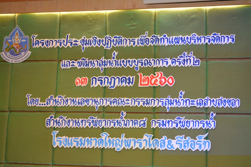 วันที่ 13 กรกฎาคม 2560 สำนักงานทรัพยากรน้ำภาค 8 โดยส่วนประสานและบริหารจัดการลุ่มน้ำทะเลสาบสงขลา จัดโครงการประชุมเชิงปฏิบัติการเพื่อจัดทำแผนบริหารจัดการและพัฒนาลุ่มน้ำแบบบูรณาการ ครั้งที่ 2 ณ โรงแรมหาดใหญ่พาราไดส แอนด์ รีสอร์ท อ.หาดใหญ่ จ.สงขลา วิทยากรบรรยายโดยนายสัมพันธ์ ดุลยาภรณ์ ผู้อำนวยการส่วนประสานและบริหารจัดการลุ่มน้ำทะเลสาบสงขลา และนางสาวบุญธิดา เปล่งแสง ผู้อำนวยการส่วนยุทธศาสตร์ ผู้เข้าร่วมประชุมประกอบด้วย คณะกรรมการลุ่มน้ำ คณะอนุกรรมการลุ่มน้ำ คณะทำงานลุ่มน้ำ เครือข่ายและประชาชนในพื้นที่ลุ่มน้ำ ส่วนราชการที่เกี่ยวข้อง เจ้าหน้าที่และผู้สังเกตการณ์ รวมทั้งสิ้น 73 คน โดยมีวัตถุประสงค์เพื่อให้องค์กรลุ่มน้ำและผู้มีส่วนได้ส่วนเสีย มีส่วนร่วมในการจัดทำแผนบริหารจัดการและพัฒนาลุ่มน้ำแบบบูรณาการ