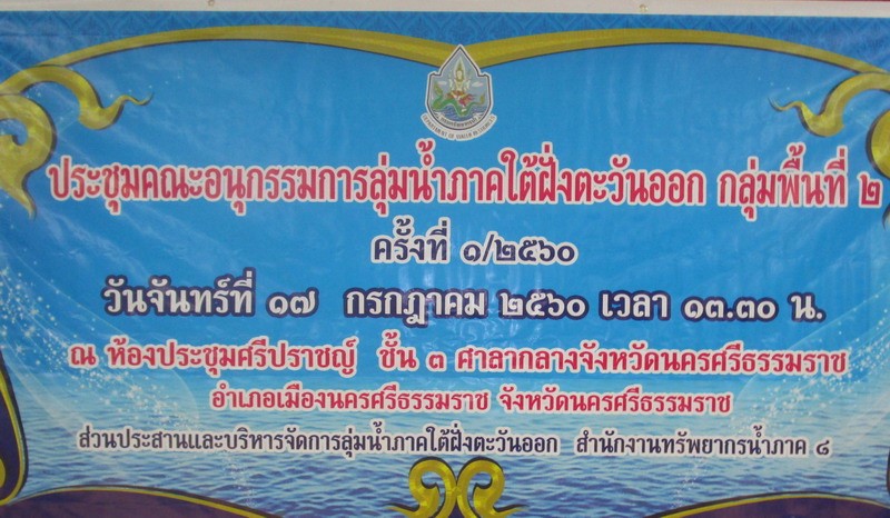 สำนักงานเลขานุการคณะกรรมการลุ่มน้ำภาคใต้ฝั่งตะวันออก สำนักงานทรัพยากรน้ำภาค 8 จัดประชุมคณะอนุกรรมการลุ่มน้ำลุ่มน้ำภาคใต้ฝั่งตะวันออก กลุ่มพื้นที่ 2 ครั้งที่ 1/2560 เมื่อช่วงบ่ายวันที่ 17 กรกฎาคม 2560ห้องประชุมศรีปราชญ์ ชั้น 3 ศาลากลางจังหวัดนครศรีธรรมราช อำเภอเมือง จังหวัดนครศรีธรรมราช เพื่อรับทราบผลการดำเนินงานโครงการ/กิจกรรม ที่ได้รับงบประมาณปี 2560 ในพื้นที่ลุ่มน้ำภาคใต้ฝั่งตะวันออก กลุ่มพื้นที่ 2 จากหน่วยงานที่เกี่ยวข้อง และสภาพปัญหาในพื้นที่ลุ่มน้ำฯ พร้อมทั้งได้ร่วมกันพิจารณากำหนดเป้าหมายเชิงพื้นที่ และปัญหาเร่งด่วนที่จะดำเนินการในพื้นที่ลุ่มน้ำฯปีงบประมาณ 2562- 2564 มีคณะอนุกรรมการฯ , ผู้สังเกตการณ์ และเจ้าหน้าที่ผู้เกี่ยวข้องเข้าร่วมประชุม รวมจำนวน 25 คน โดยมีนายดนัย เจียมวิเศษสุข รองผู้ว่าราชการจังหวัดนครศรีธรรมราช รับมอบหมายจากผู้ว่าราชการจังหวัดนครศรีธรรมราช เป็นประธานการประชุม