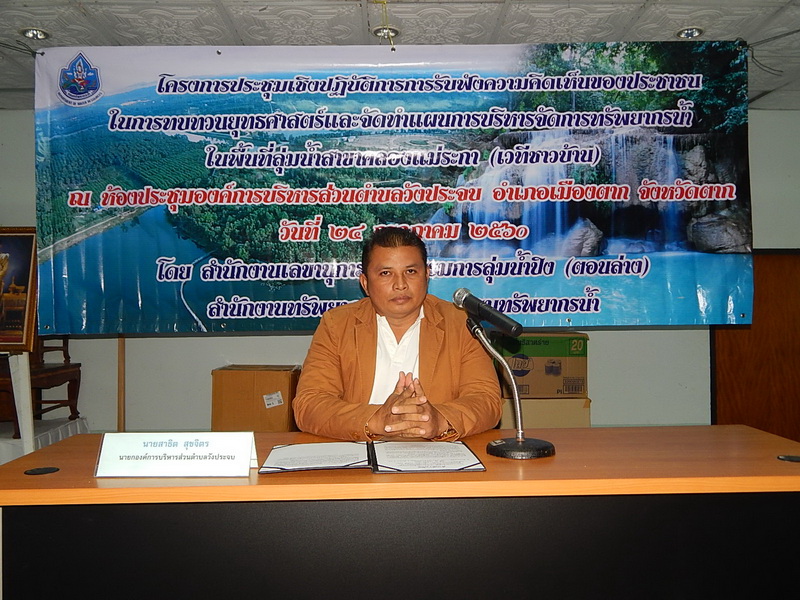 วันที่ 24 กรกฎาคม 2560 สำนักงานทรัพยากรน้ำภาค 1 โดยส่วนประสานและบริหารจัดการลุ่มน้ำปิงตอนล่าง ได้จัดประชุมเชิงปฏิบัติการรับฟังความคิดเห็นของประชาชน ในการทบทวนและจัดทำแผนการบริหารจัดการทรัพยากรน้ำ ในพื้นที่ลุ่มน้ำสาขาคลองแม่ระกา (เวทีชาวบ้าน) ประจำปี 2560 ณ ห้องประชุมองค์การบริหารส่วนตำบลวังประจบ อ.เมืองตาก จ.ตาก โดยได้รับเกียรติจาก นายสาธิต สุขจิตร นายกองค์การบริหารส่วนตำบลวังประจบ เป็นประธานในพิธี มีผู้เข้าร่วมประชุม จำนวน74 คน