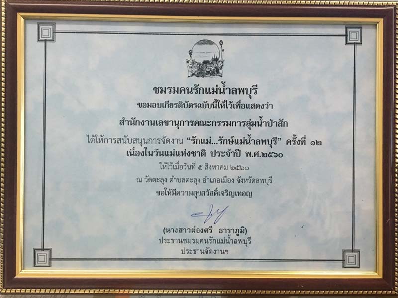 นายเอนก ชมพานิชย์ ผู้อำนวยการสำนักงานทรัพยากรน้ำภาค 2 มอบหมายให้ นางจารุทรรศน์ สื่อประเสริฐสุข ผู้อำนวยการส่วนประสานและบริหารจัดการลุ่มน้ำป่าสัก พร้อมเจ้าหน้าที่ ร่วมงาน "รักแม่...รักษ์แม่น้ำลพบุรี" ครั้งที่ 12 เนื่องในวันแม่แห่งชาติ 12 สิงหามหาราชินี ในรัชกาลที่ 9 ในวันเสาร์ที่ 5 สิงหาคม 2560 ณ ริมฝั่งแม่น้ำลพบุรี บริเวณพิธีวัดตะลุง อำเภอเมืองลพบุรี จังหวัดลพบุรี โดยมีนายภานุ แย้มศรี ผู้ว่าราชการจังหวัดลพบุรีเป็นประธาน และร่วมใส่บาตรทางเรือร่วมกับประชาชน และได้มอบเกียรติบัตรให้แก่ สำนักงานเลขานุการคณะกรรมการลุ่มน้ำป่าสัก ผู้มีอุปการคุณและผู้สนับสนุนการจัดงาน “รักแม่...รักษ์แม่น้ำลพบุรี” ครั้งที่ 12