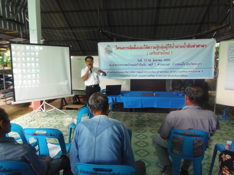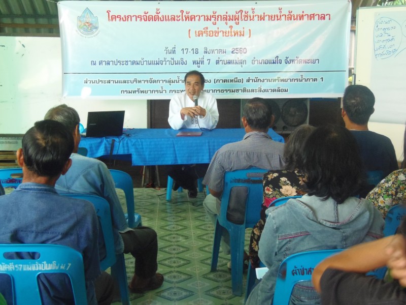สำนักงานทรัพยากรน้ำภาค 1 โดยส่วนประสานและบริหารจัดการลุ่มน้ำกกและโขง (ภาคเหนือ) ดำเนินงานโครงการจัดตั้งและให้ความรู้กลุ่มผู้ใช้น้ำฝายน้ำล้นท่าศาลา (เครือข่ายใหม่) พื้นที่ลุ่มน้ำสาขาน้ำแม่อิงตอนบน ในวันที่ 17 - 18 มกราคม 2560 ณ ศาลาประชาคมบ้านแม่จว้าปันเจิง ตำบลแม่สุก อำเภอแม่ใจ จังหวัดพะเยา โดยมี ว่าที่ร้อยตรี จำรัส โสตถิกุล นายอำเภอแม่ใจ เป็นประธาน มีผู้เข้าร่วม 81 คน ประกอบด้วยกลุ่มผู้ใช้น้ำ ฝายน้ำล้นท่าศาลา ผู้แทนองค์กรปกครองส่วนท้องถิ่น และประชาชนในพื้นที่