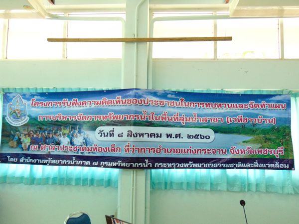 สำนักงานทรัพยากรน้ำภาค ๗ โดยส่วนประสานและบริหารจัดการลุ่มน้ำเพชรบุรีและประจวบคีรีขันธ์ จัดโครงการรับฟังความคิดเห็นของประชาชนในการทบทวนและจัดทำแผนการบริหารจัดการทรัพยากรน้ำในพื้นที่ลุ่มน้ำสาขา (เวทีชาวบ้าน) วันที่ ๘ สิงหาคม ๒๕๖๐ ณ ศาลาประชาคมห้องเล็ก ที่ว่าการอำเภอแก่งกระจาน จังหวัดเพชรบุรี โดยมี นายมนตรี โภโค นายช่างโยธาชำนาญงาน สำนักงานทรัพยากรน้ำภาค ๗ บรรยายเรื่องการบริหารจัดการน้ำในสถานการณ์ปัจจุบัน ยุทธศาสตร์การบริหารจัดการทรัพยากรน้ำของประเทศ และการจัดทำยุทธศาสตร์ลุ่มน้ำสาขา เจ้าหน้าที่จากสำนักงานทรัพยากรน้ำภาค ๗ เป็นวิทยากรกลุ่ม ทบทวนประเด็นปัญหาในพื้นที่และการกำหนดแผนงาน/โครงการด้านการบริหารจัดการทรัพยากรน้ำของอำเภอแก่งกระจาน ผู้เข้าร่วมโครงการประกอบด้วย ผู้แทนองค์กรปกครองส่วนท้องถิ่น กำนัน ผู้ใหญ่บ้าน ผู้นำชุมชน จำนวน ๓๖ คน