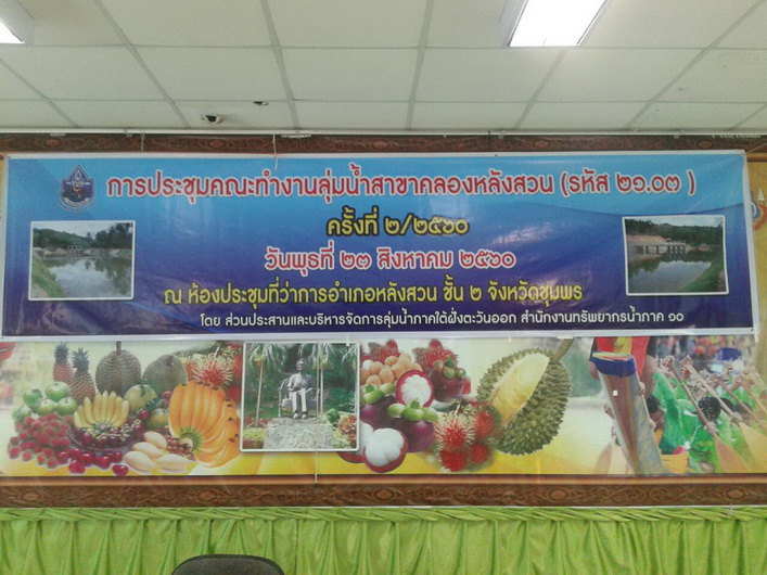 วันนี้( 23 สิงหาคม 2560) นายสาธิต รัตนสิงห์ ผู้อำนวยการสำนักงานทรัพยากรน้ำภาค 10 มอบหมายให้นายสุวัฒน์ ศรีช่วง ผู้อำนวยการส่วนประสานและบริหารจัดการลุ่มน้ำภาคใต้ฝั่งตะวันออก ส่วนที่ 1จังหวัดชุมพร จัดประชุมคณะทำงานลุ่มน้ำสาขาคลองหลังสวน ครั้งที่ 2/2560 ณ ห้องประชุมที่ว่าการอำเภอหลังสวน ชั้น 2 อำเภอหลังสวน จังหวัดชุมพร โดยมีนายวันชัย ขุนรินทร์ ปลัดอำเภออาวุโส เป็นประธานคณะทำงาน เพื่อทราบการเตรียมการป้องกัน การแก้ไขปัญหาในการบริหารจัดการภาวะน้ำท่วม ปี พ.ศ. 2560 และเพื่อพิจารณาร่างแผนปฏิบัติการบริหารจัดการทรัพยากรน้ำแบบบูรณาการในพื้นที่ลุ่มน้ำสาขาคลองหลังสวน (รหัส 21.03) ปี 2562 ,ร่างแผนการบริหารจัดการทรัพยากรน้ำในพื้นที่ลุ่มน้ำสาขาคลองหลังสวน (รหัส 21.03) ที่ได้จากการประชุมเชิงปฏิบัติการฯ และร่างคณะทำงานลุ่มน้ำสาขาคลองหลังสวน (รหัส 21.03) โดยมีผู้เข้าร่วมประชุม จำนวน 32คน